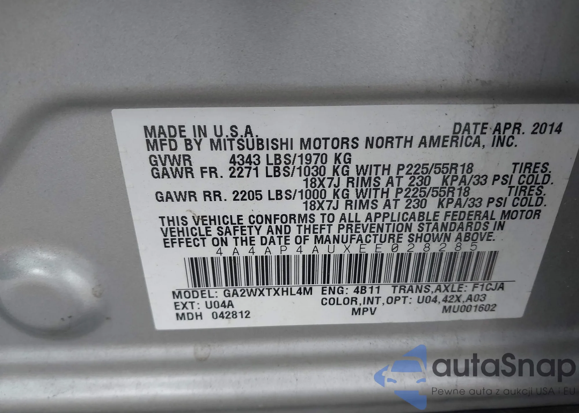 • VIN 4A4AP4AUXEE028285
