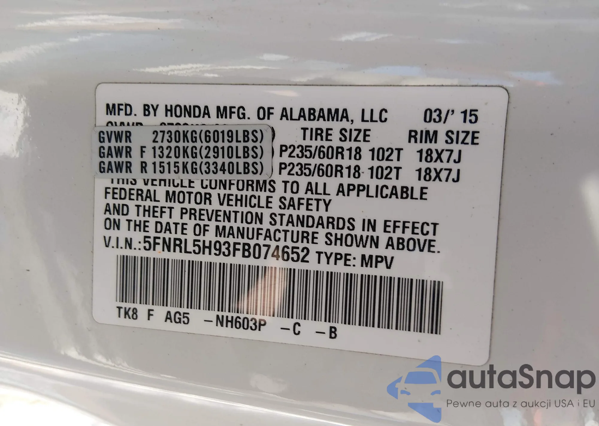 LOT: 43873491 VIN: JHLRD1875YC040252