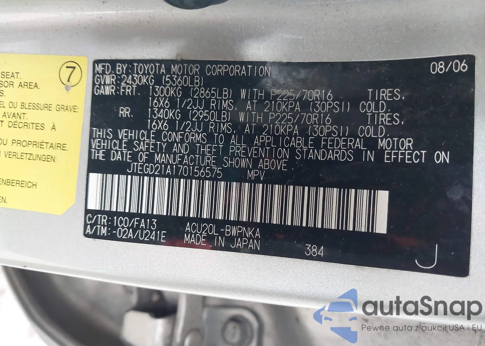 LOT: 44098878 VIN: JTEHF21A830104126
