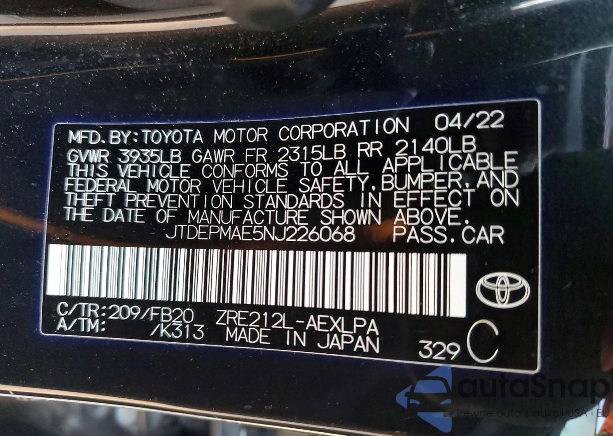 LOT: 73920055 VIN: JTDS4MCE8N3507956