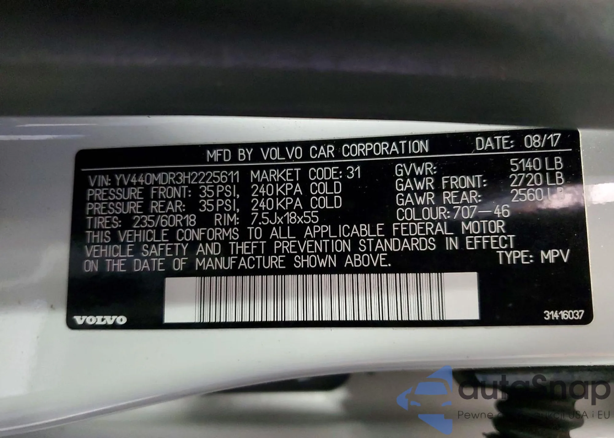 LOT: 75866705 VIN: YV4A22PK2H1141821
