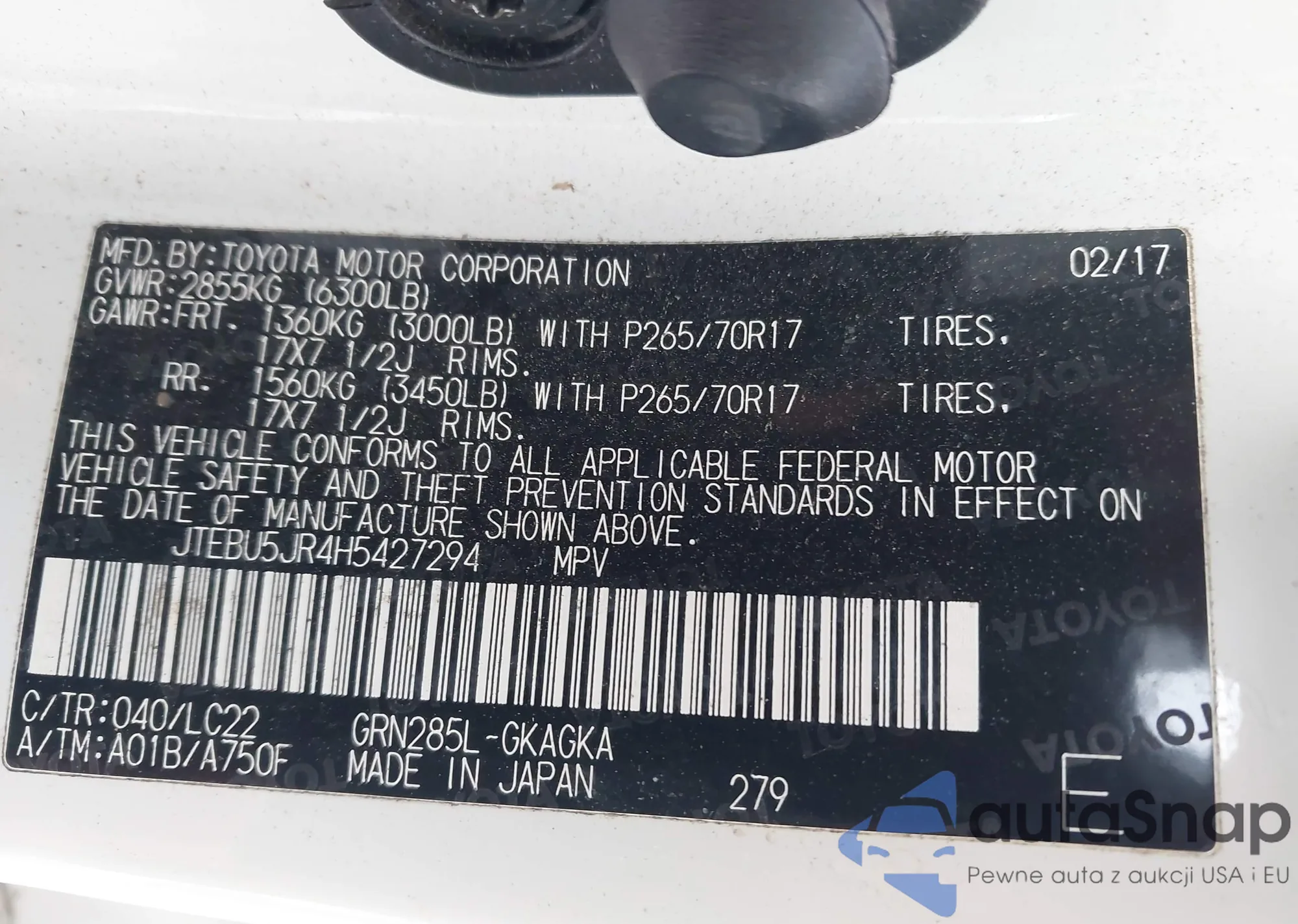 LOT: 44098595 VIN: JTEBU5JR4H5427294