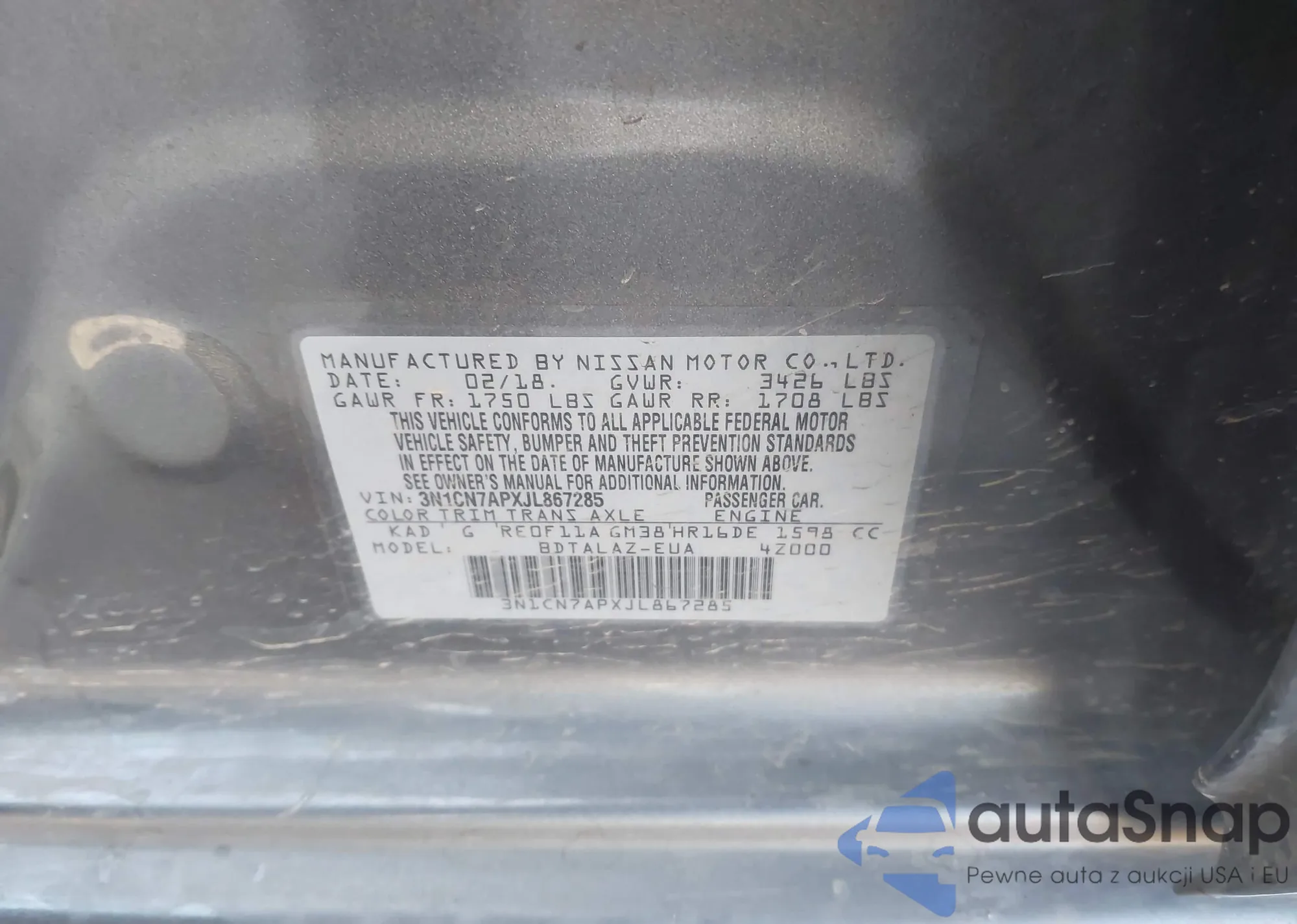 • VIN 3N1CN7APXJL867285