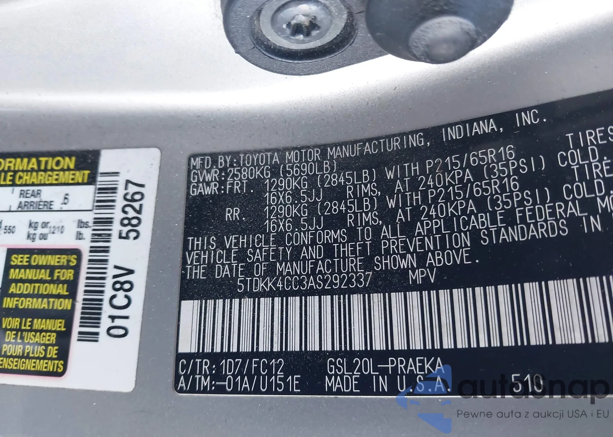 LOT: 43957340 VIN: 5TDKK4CC3AS292337