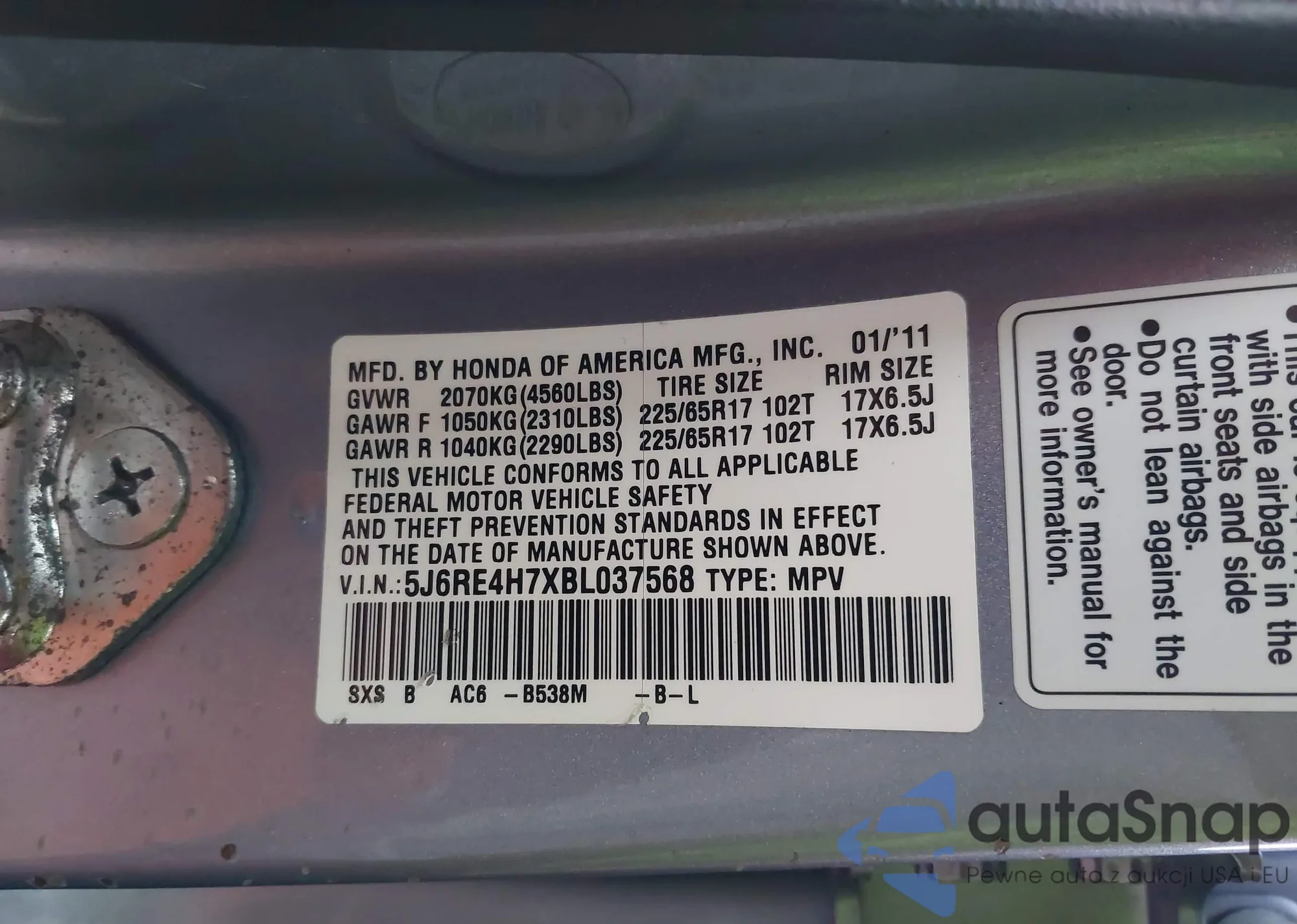 • VIN 5J6RE4H7XBL037568