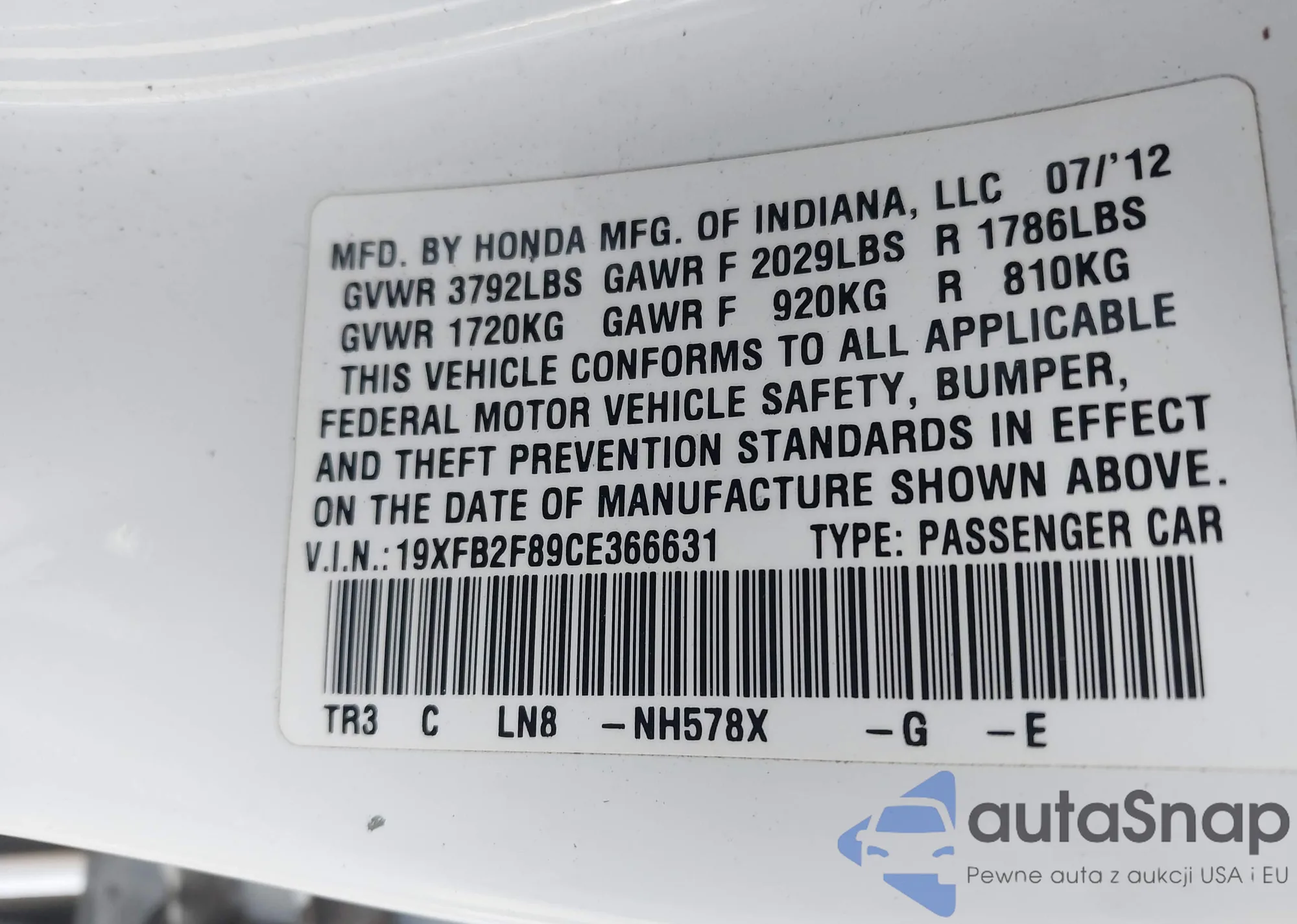 • VIN 19XFB2F89CE366631