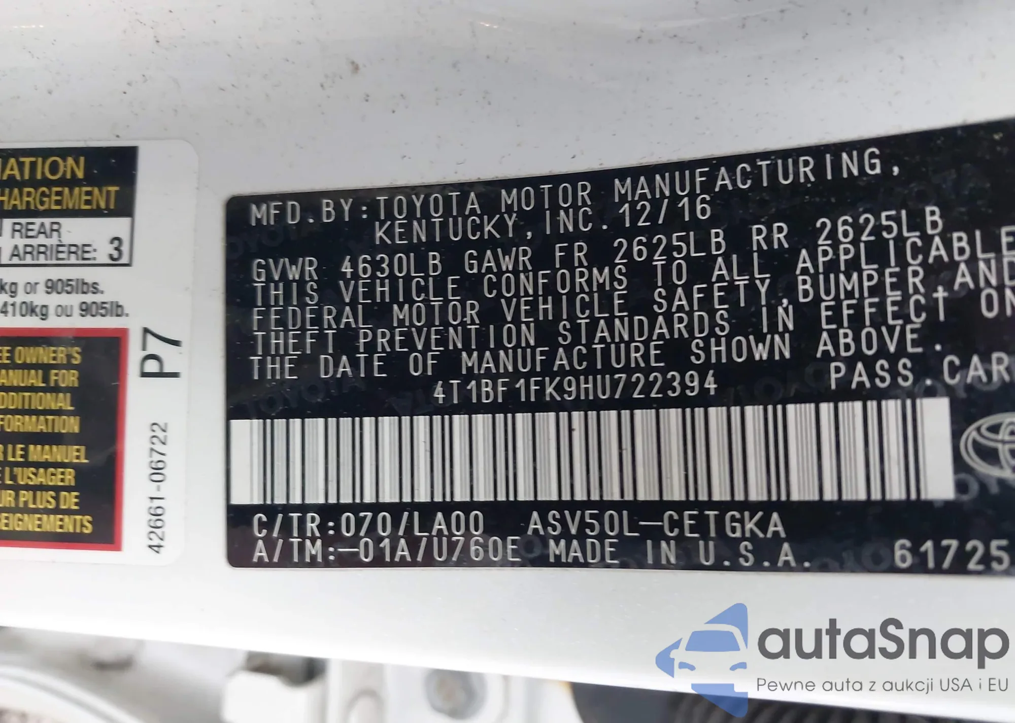 • VIN 4T1BF1FK9HU722394