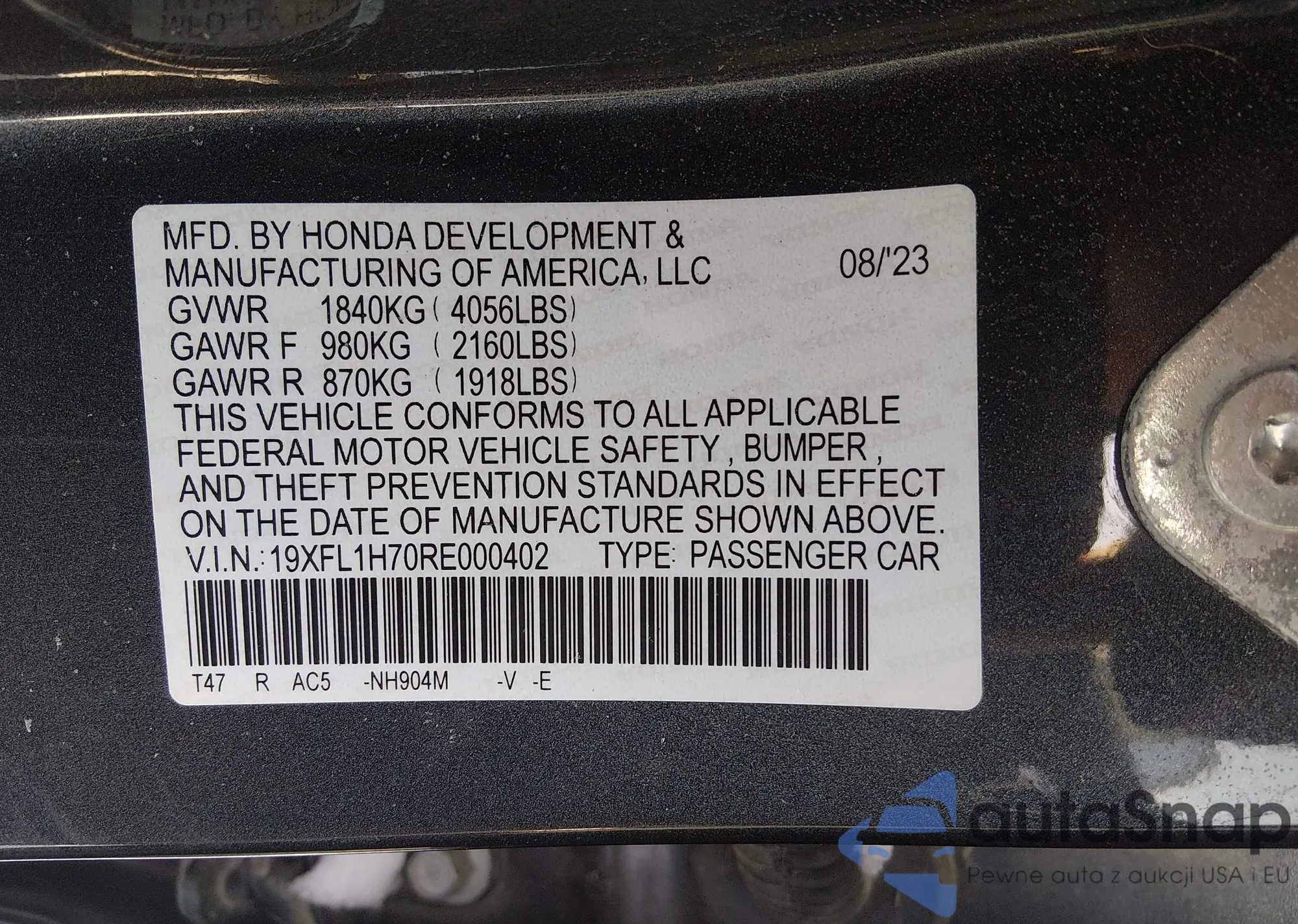 • VIN 19XFL1H70RE000402