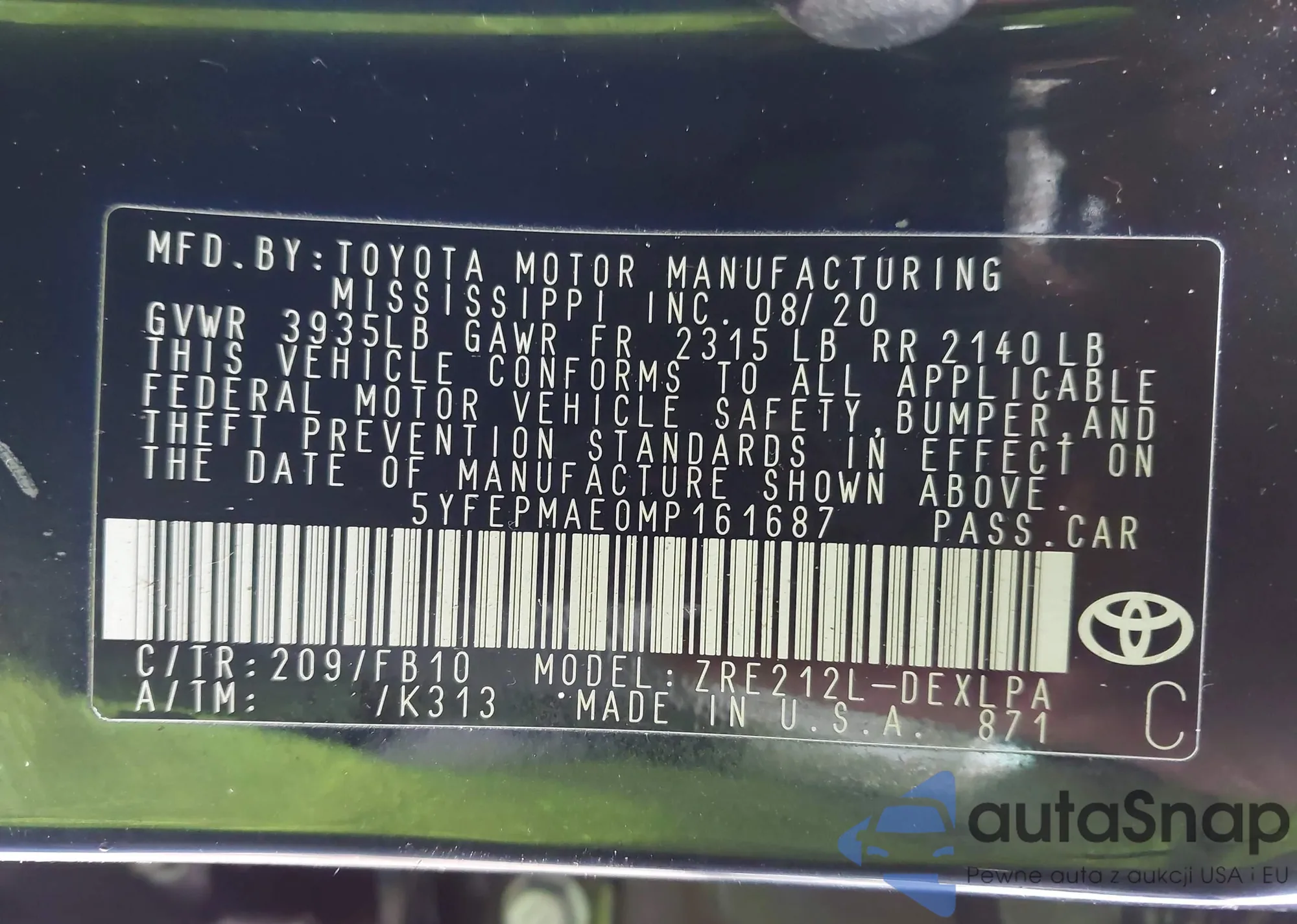 • VIN 5YFEPMAE0MP161687