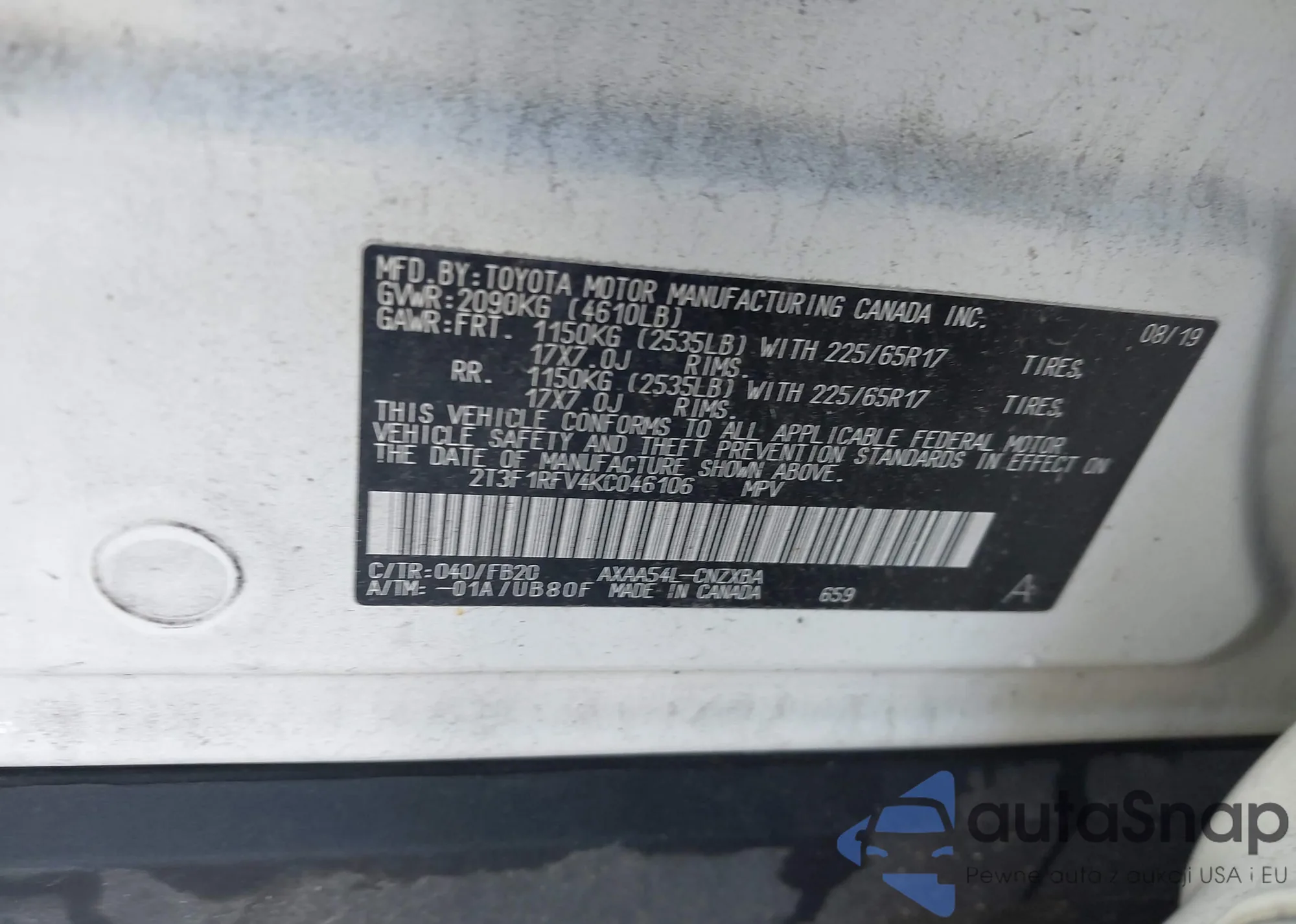 • VIN 2T3F1RFV4KC046106
