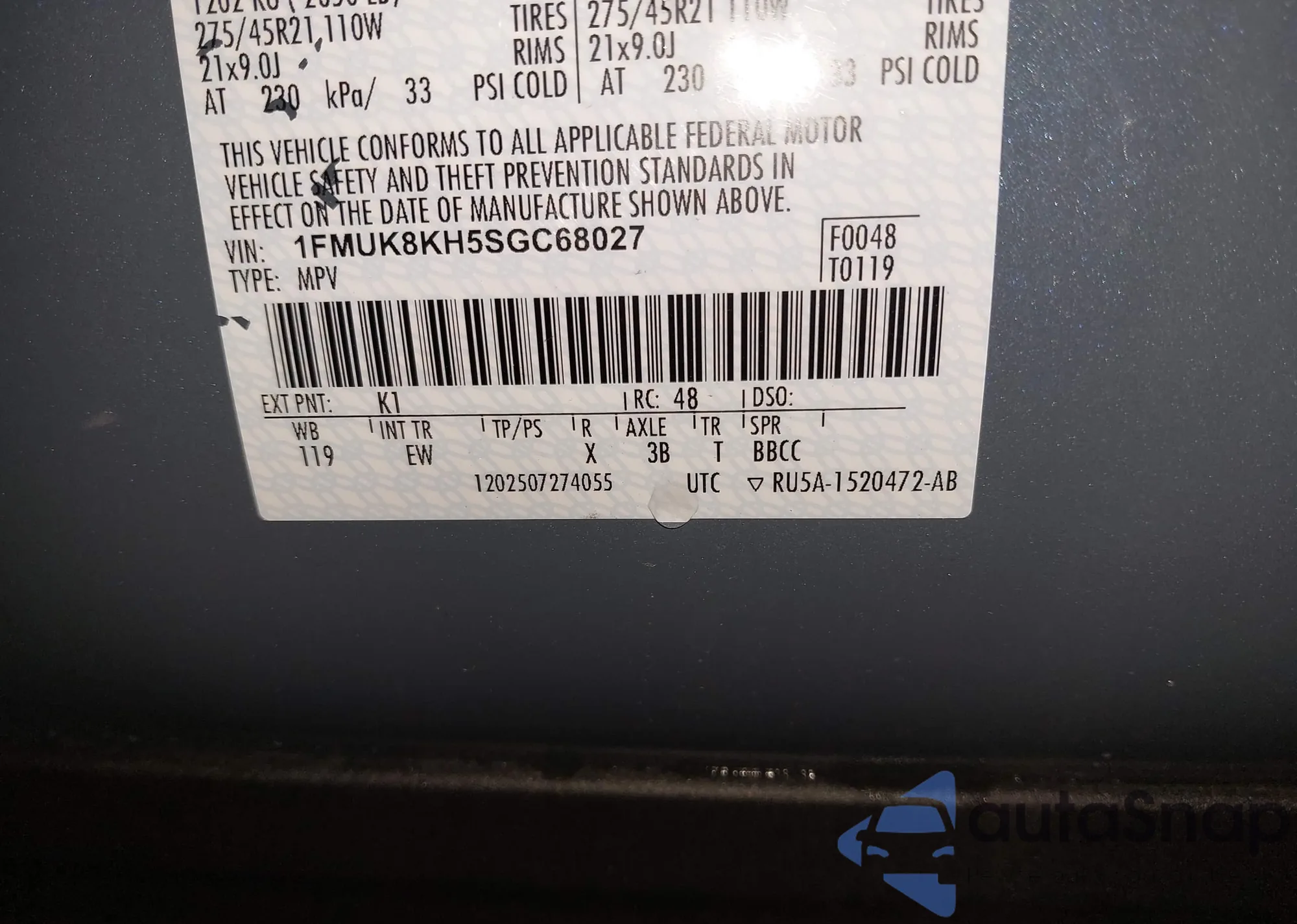 • VIN 1FMUK8KH5SGC68027
