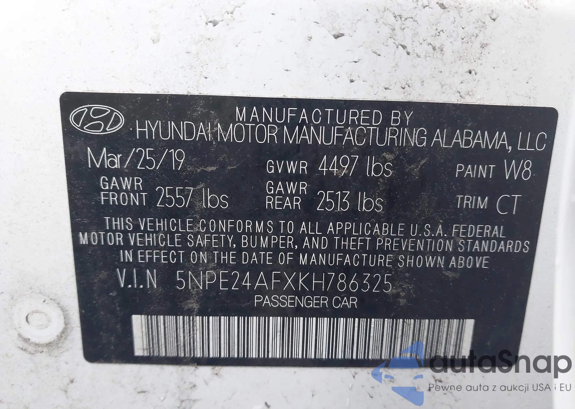 LOT: 44051382 VIN: 5NPE24AFXKH786325