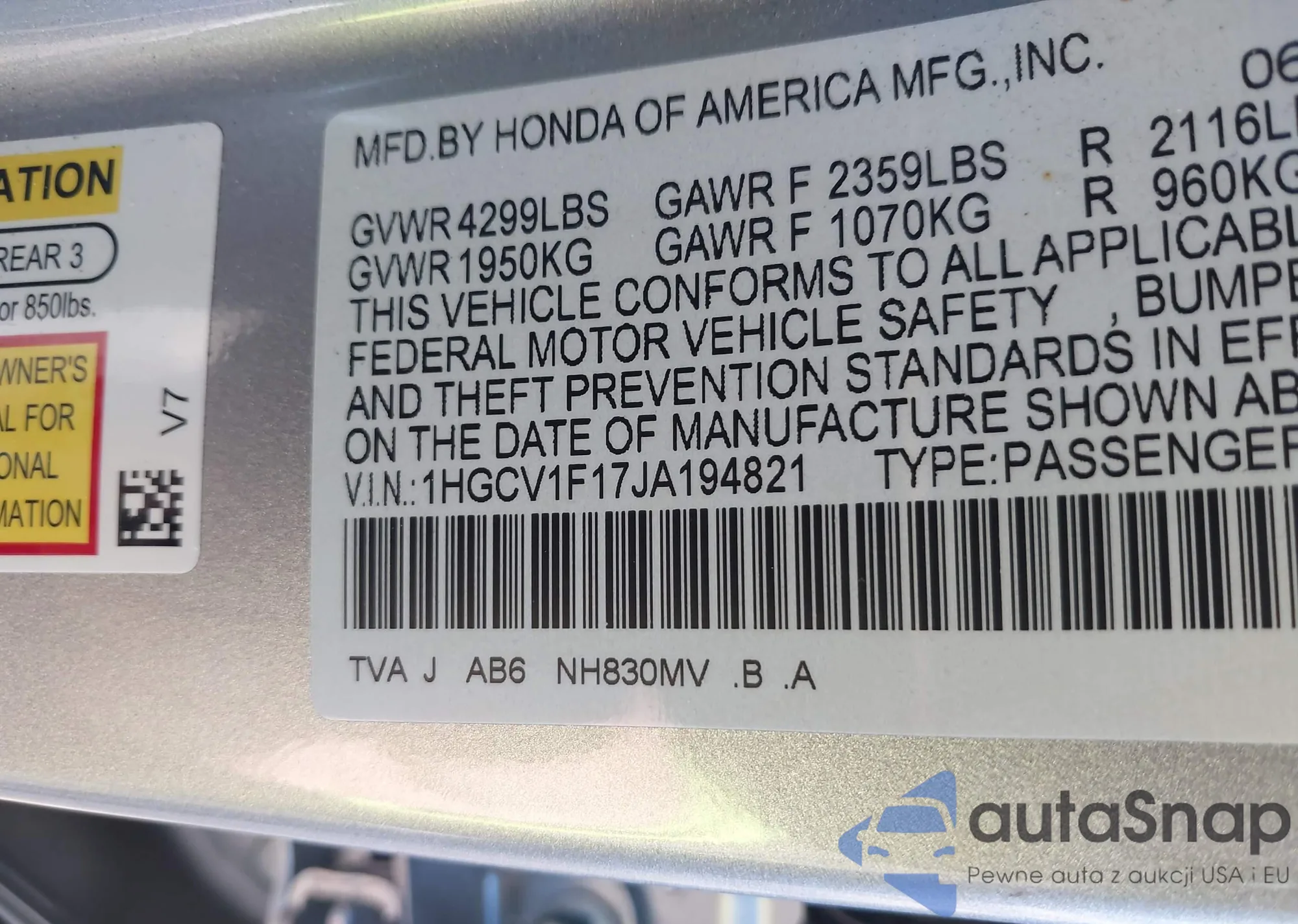 • VIN 1HGCV1F17JA194821