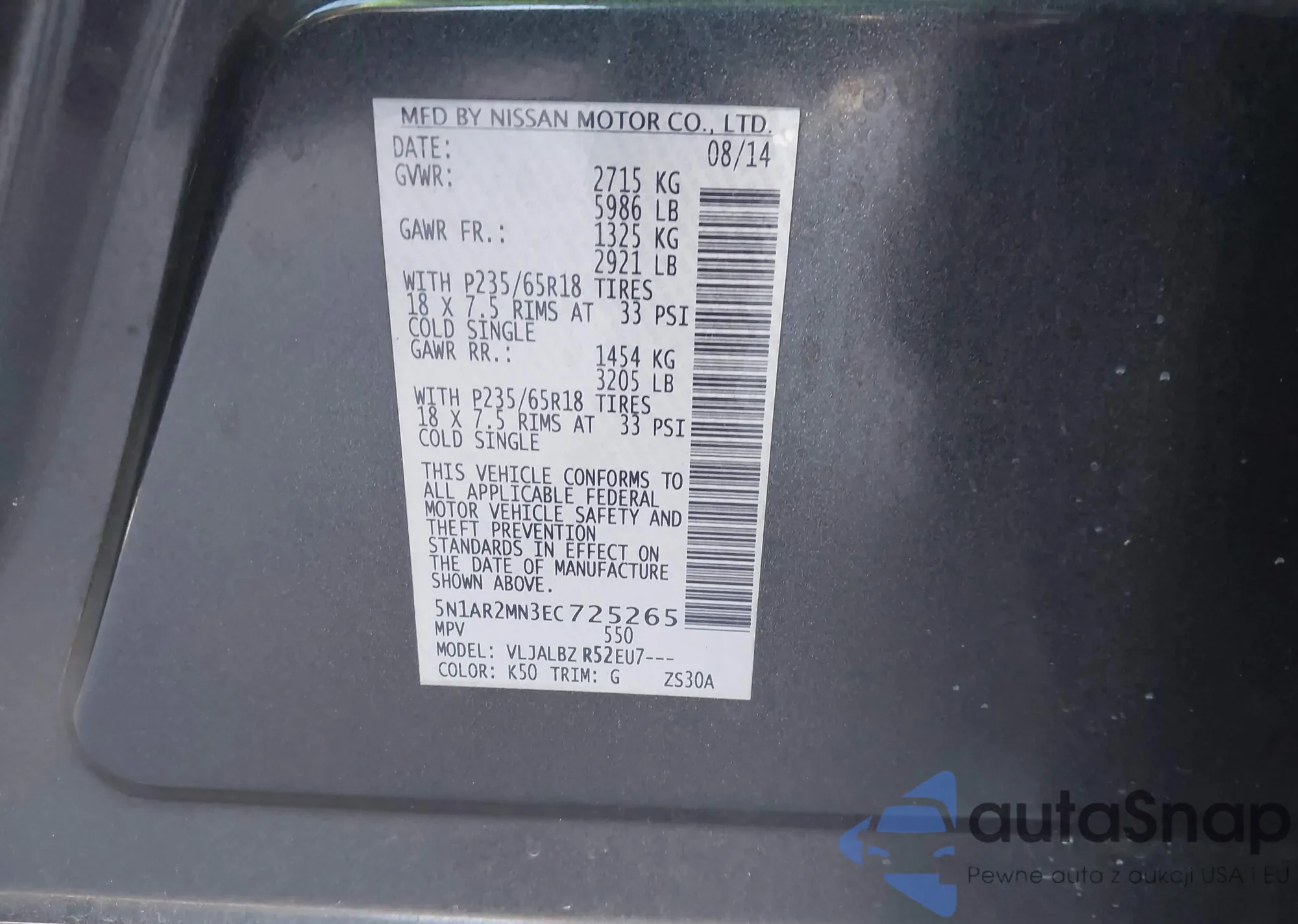 • VIN 5N1AR2MN3EC725265
