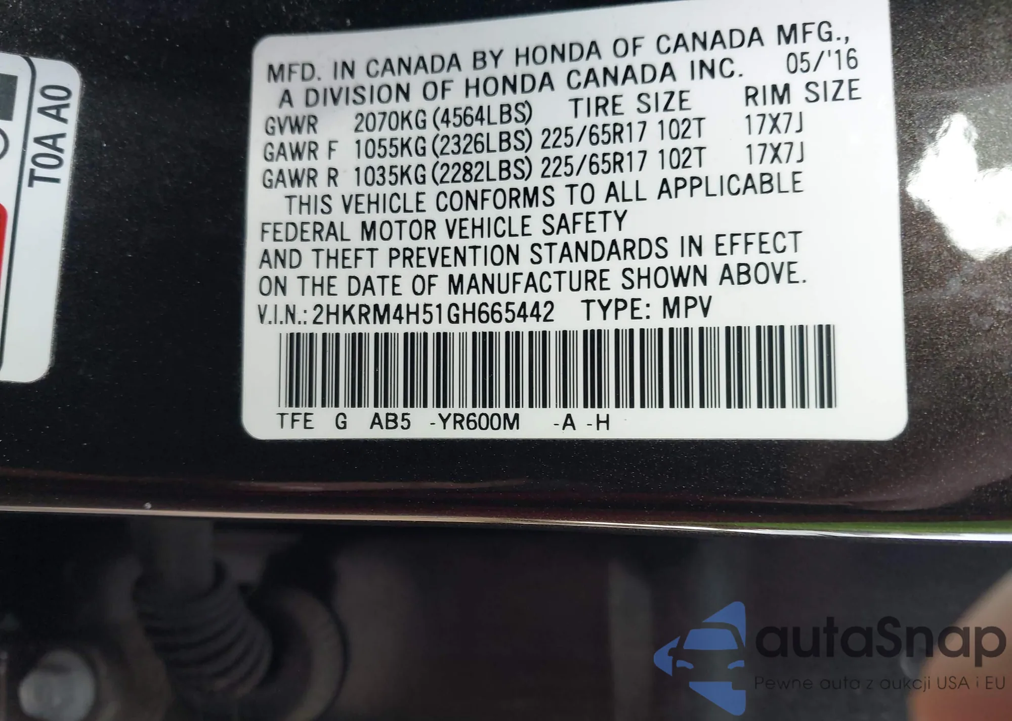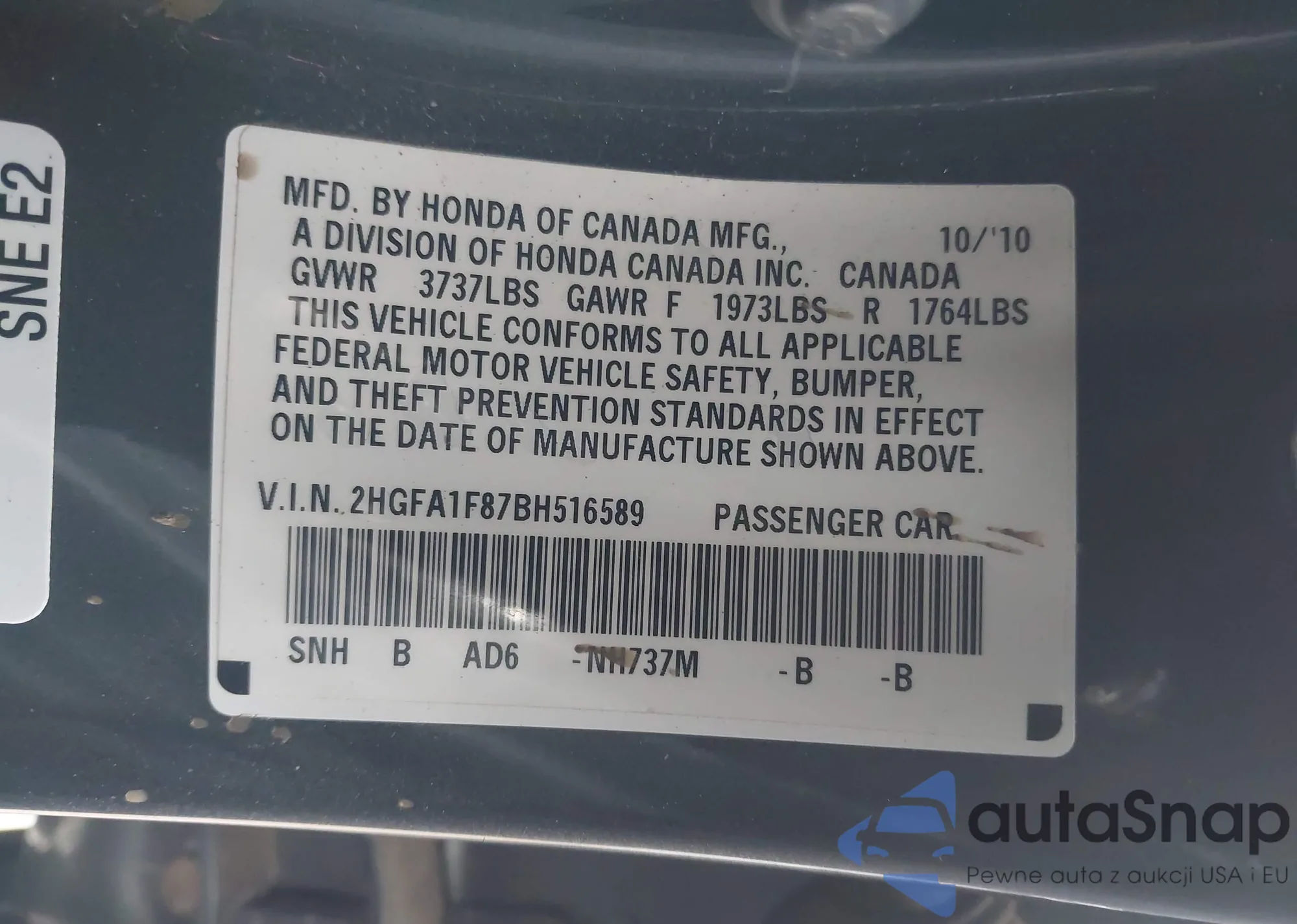 • VIN 2HGFA1F87BH516589