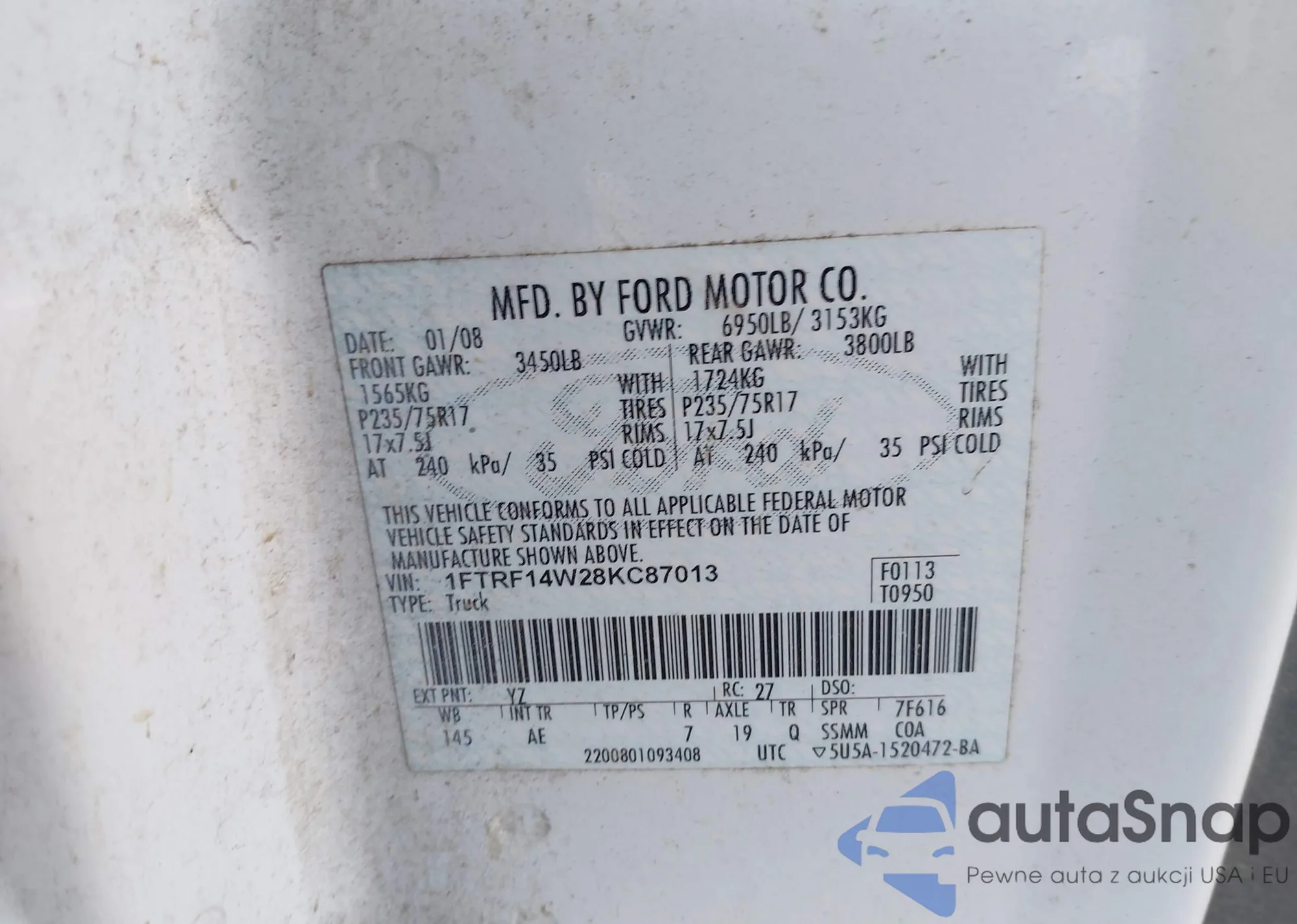 • VIN 1FTRF14W28KC87013