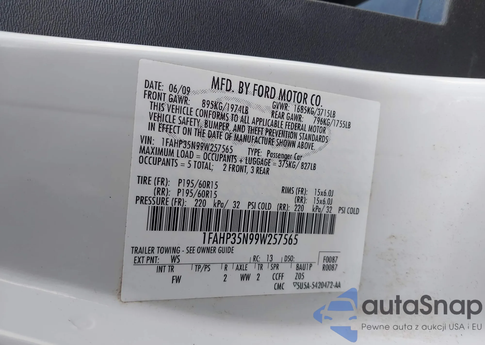 • VIN 1FAHP35N99W257565