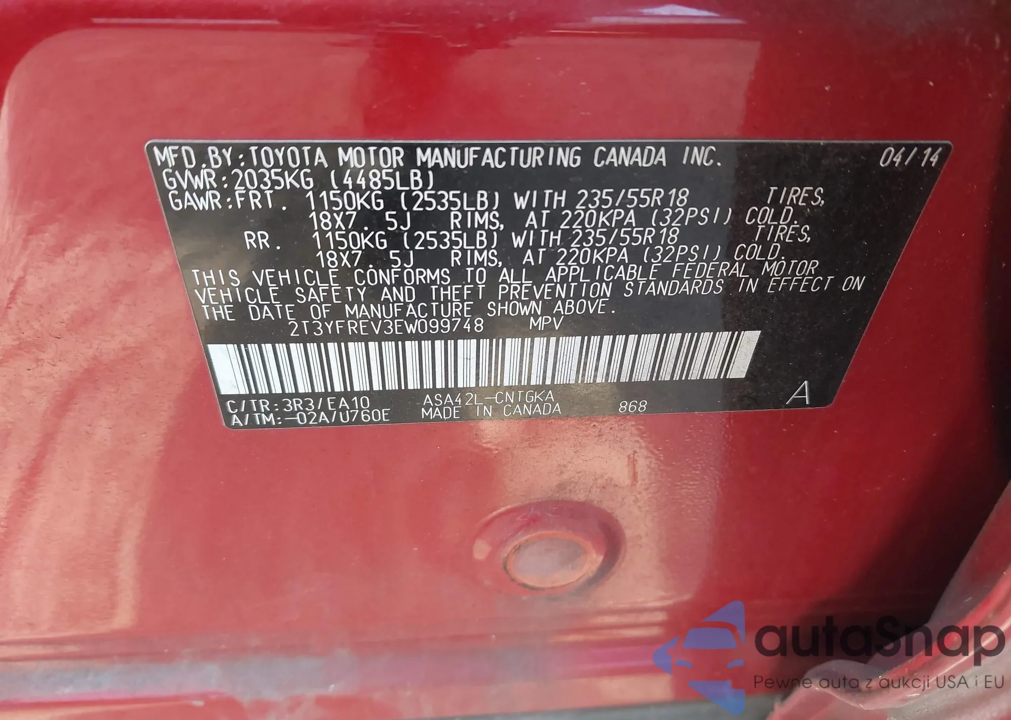 • VIN 2T3YFREV3EW099748