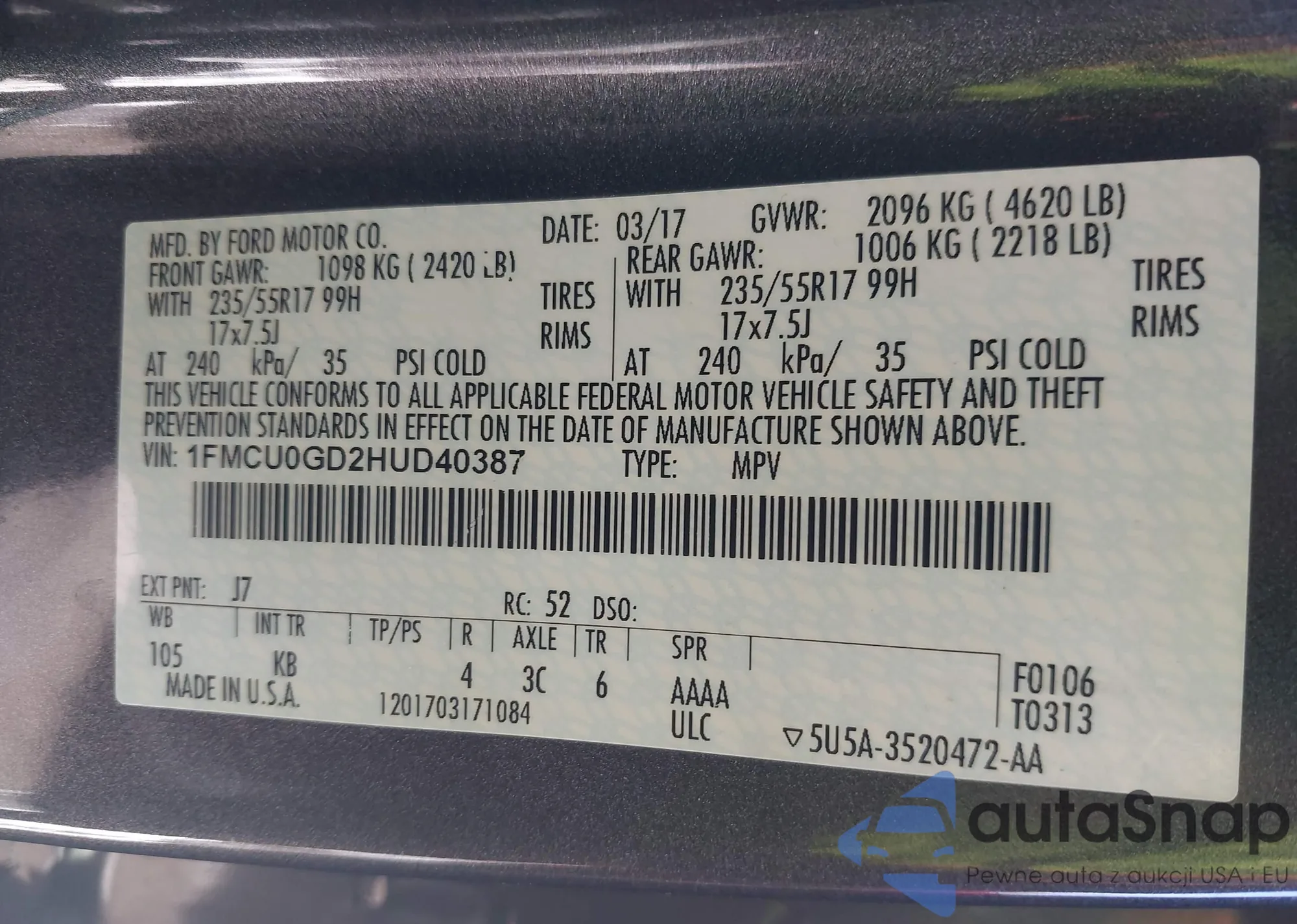 • VIN 1FMCU0GD2HUD40387