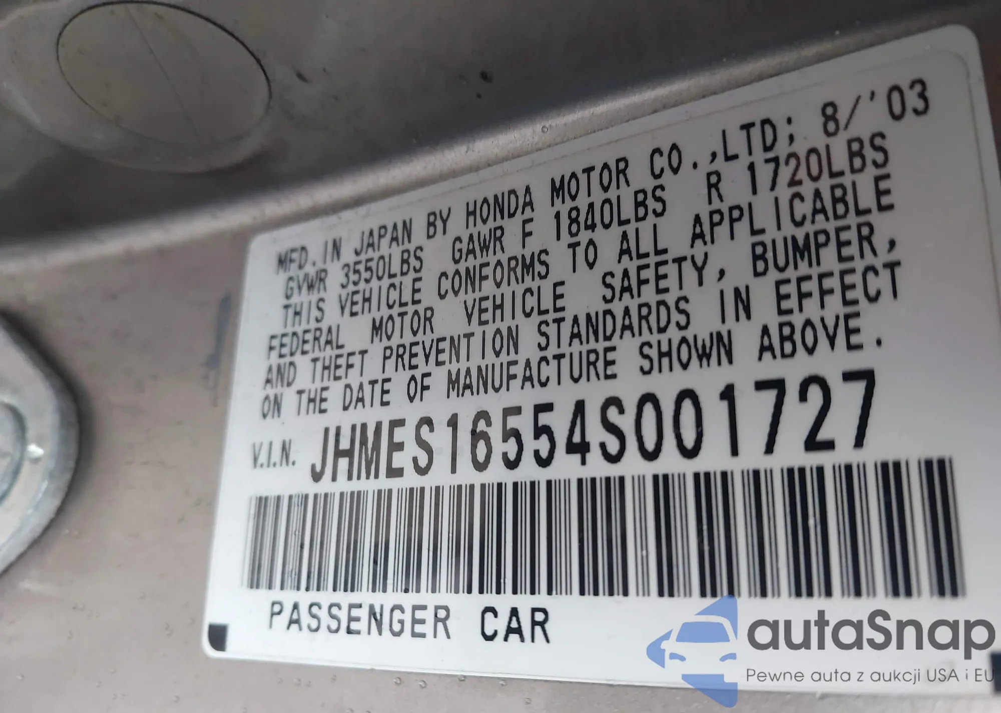 LOT: 44357285 VIN: JHMES16554S001727