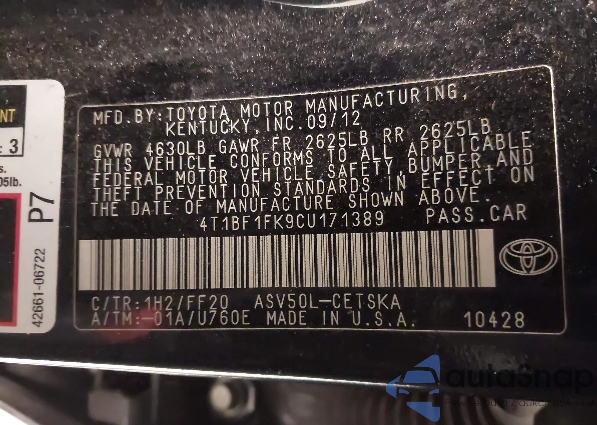 • VIN 4T1BF1FK9CU171389