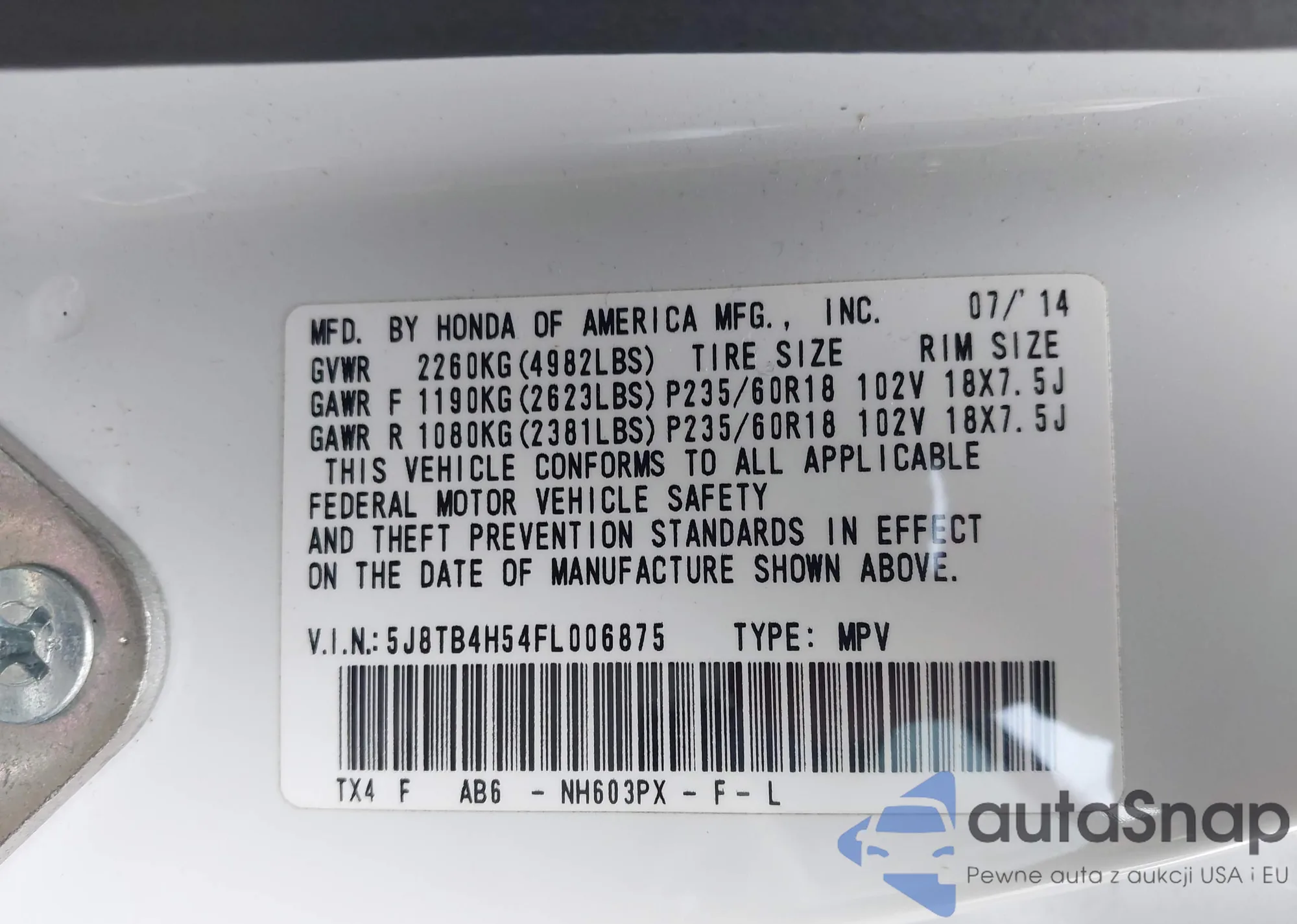 • VIN 5J8TB4H54FL006875