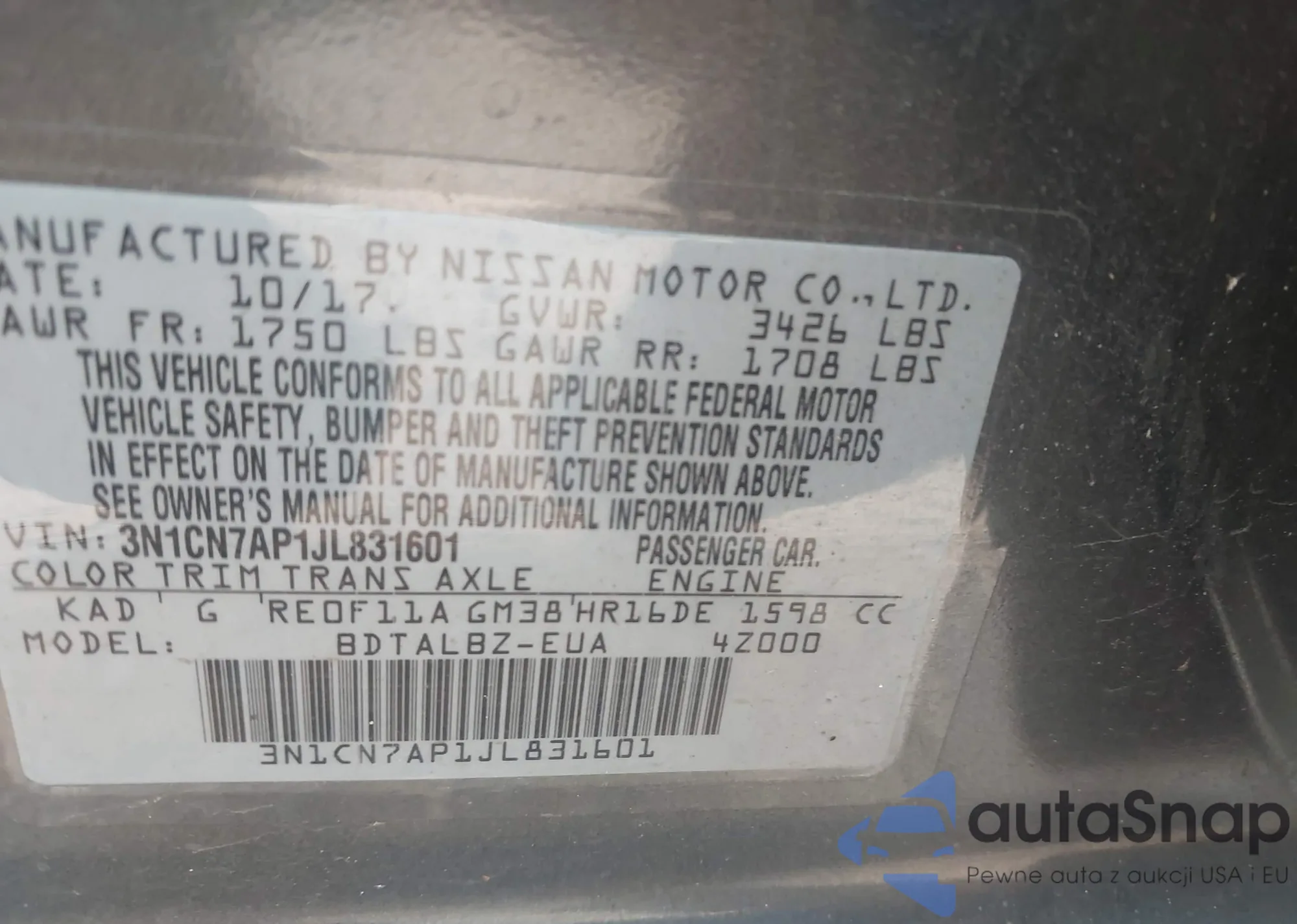 • VIN 3N1CN7AP1JL831601