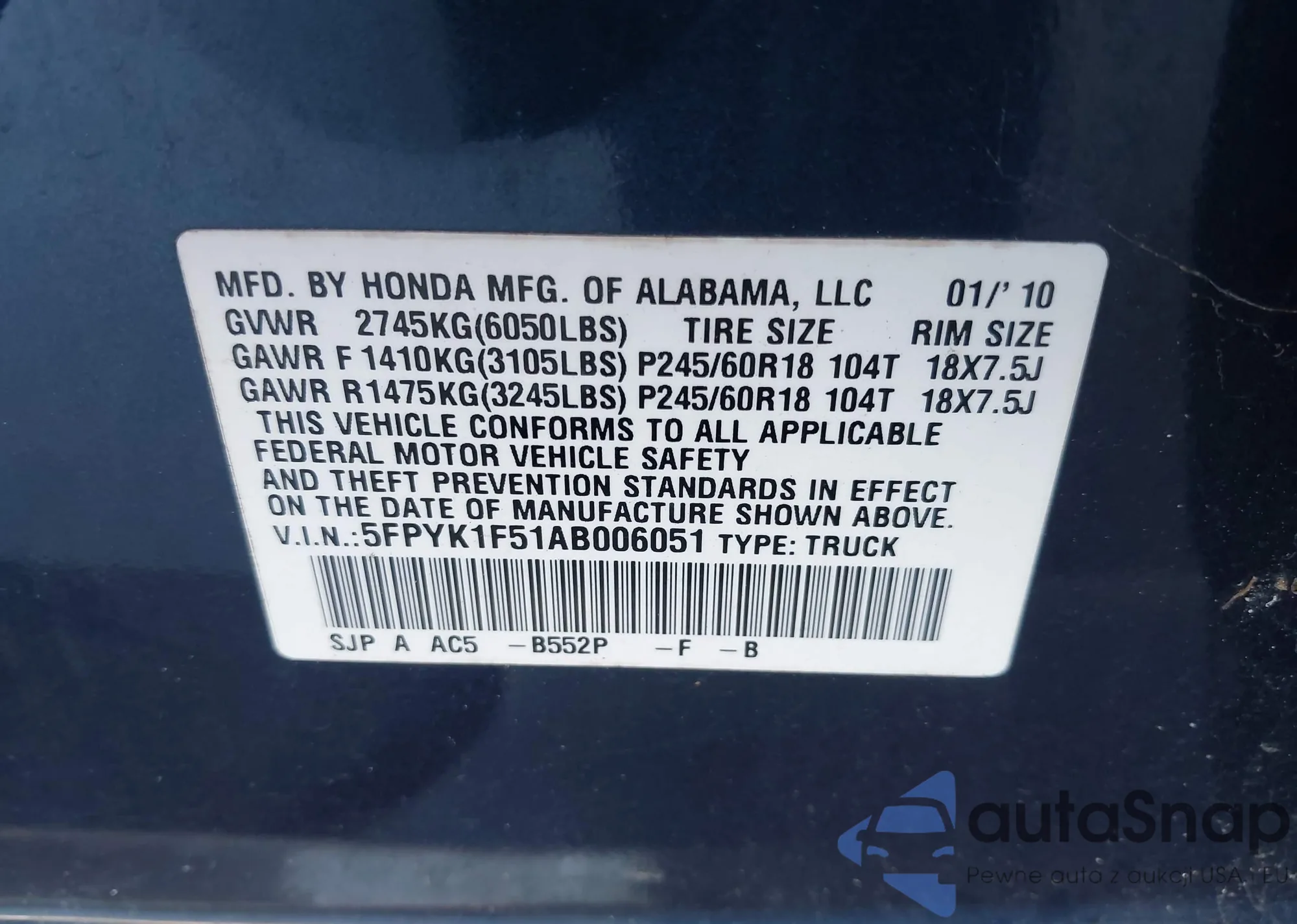 • VIN 5FPYK1F51AB006051
