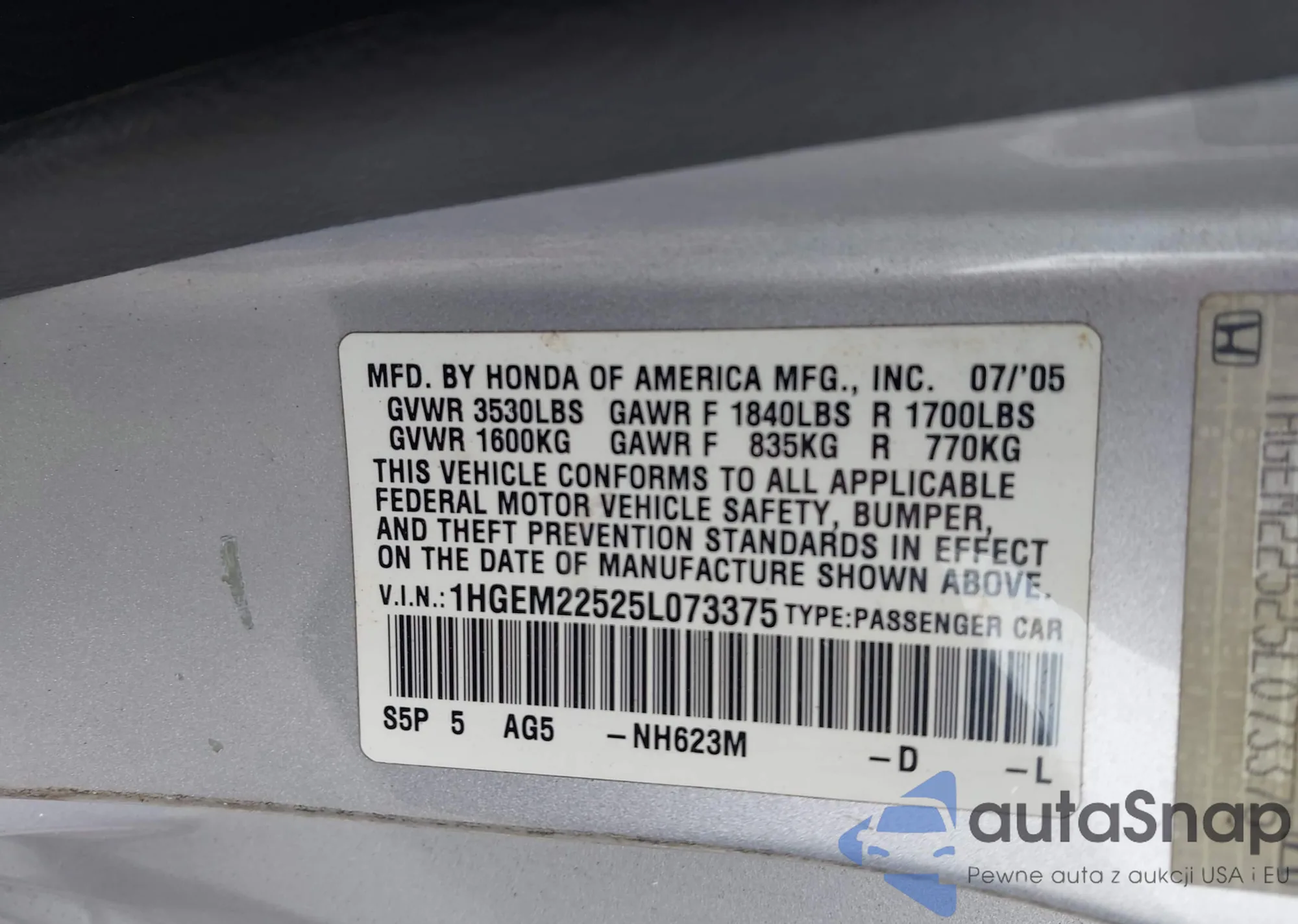 LOT: 44161272 VIN: 1HGEM22525L073375