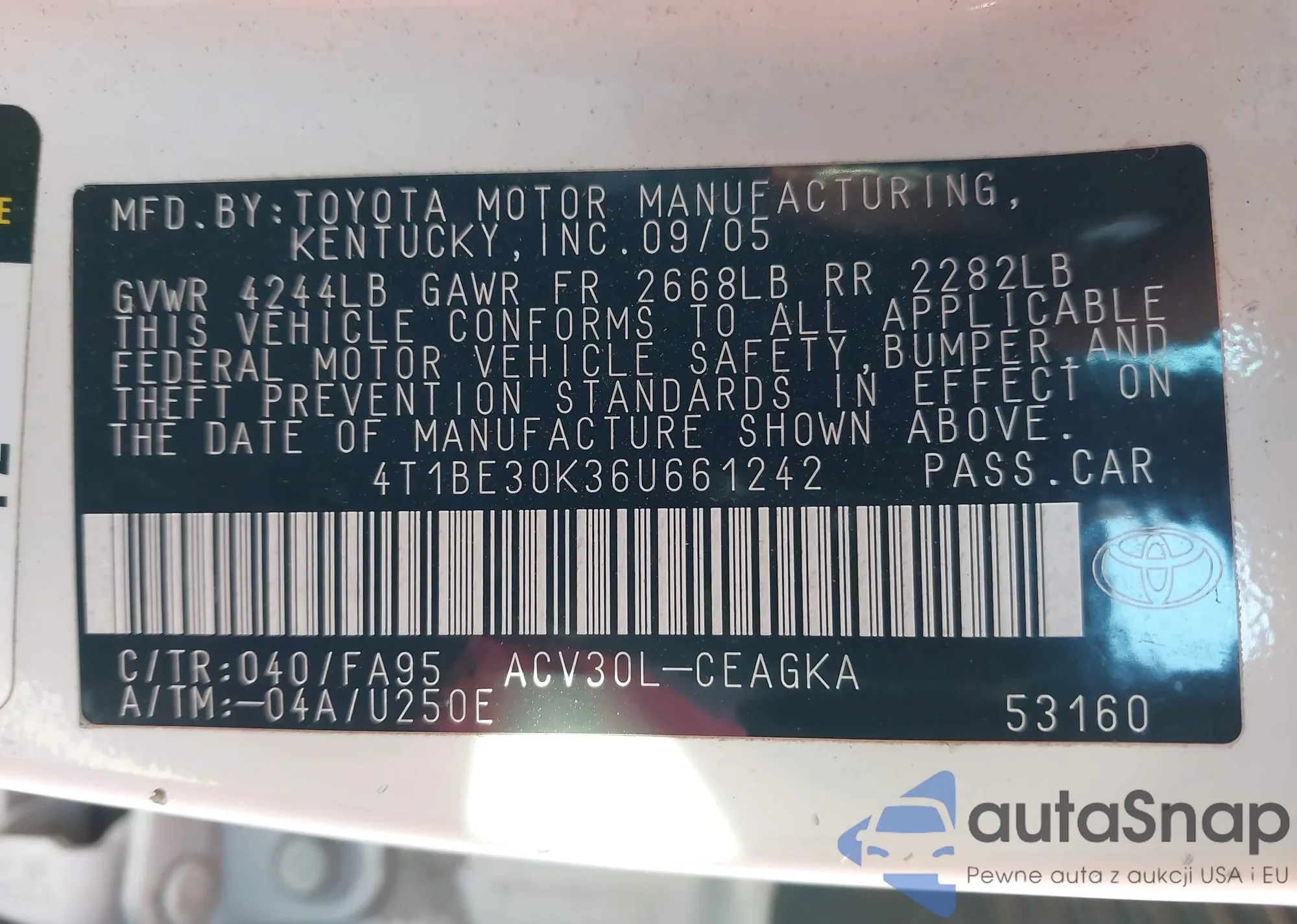 • VIN 4T1BE30K36U661242