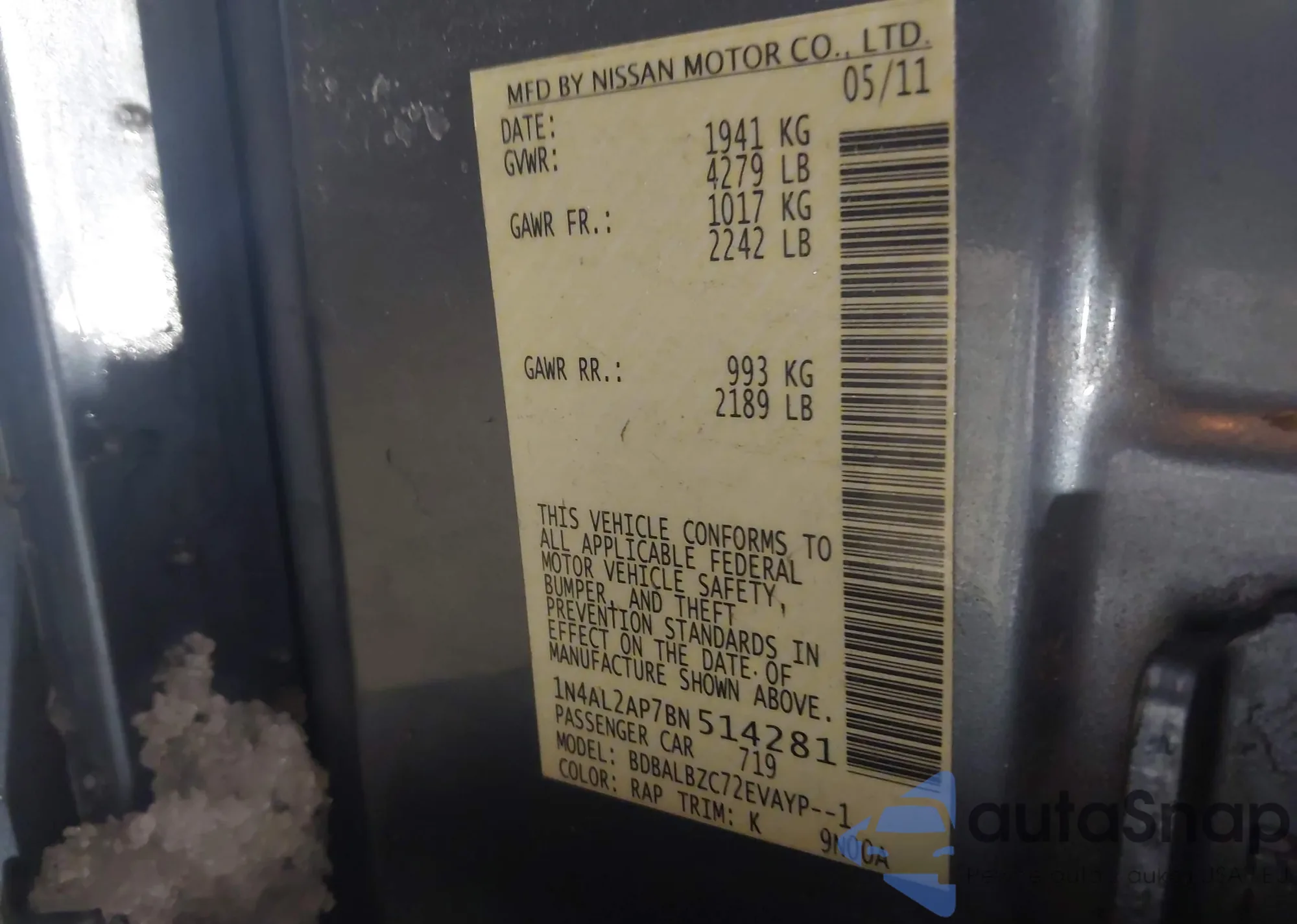 • VIN 1N4AL2AP7BN514281