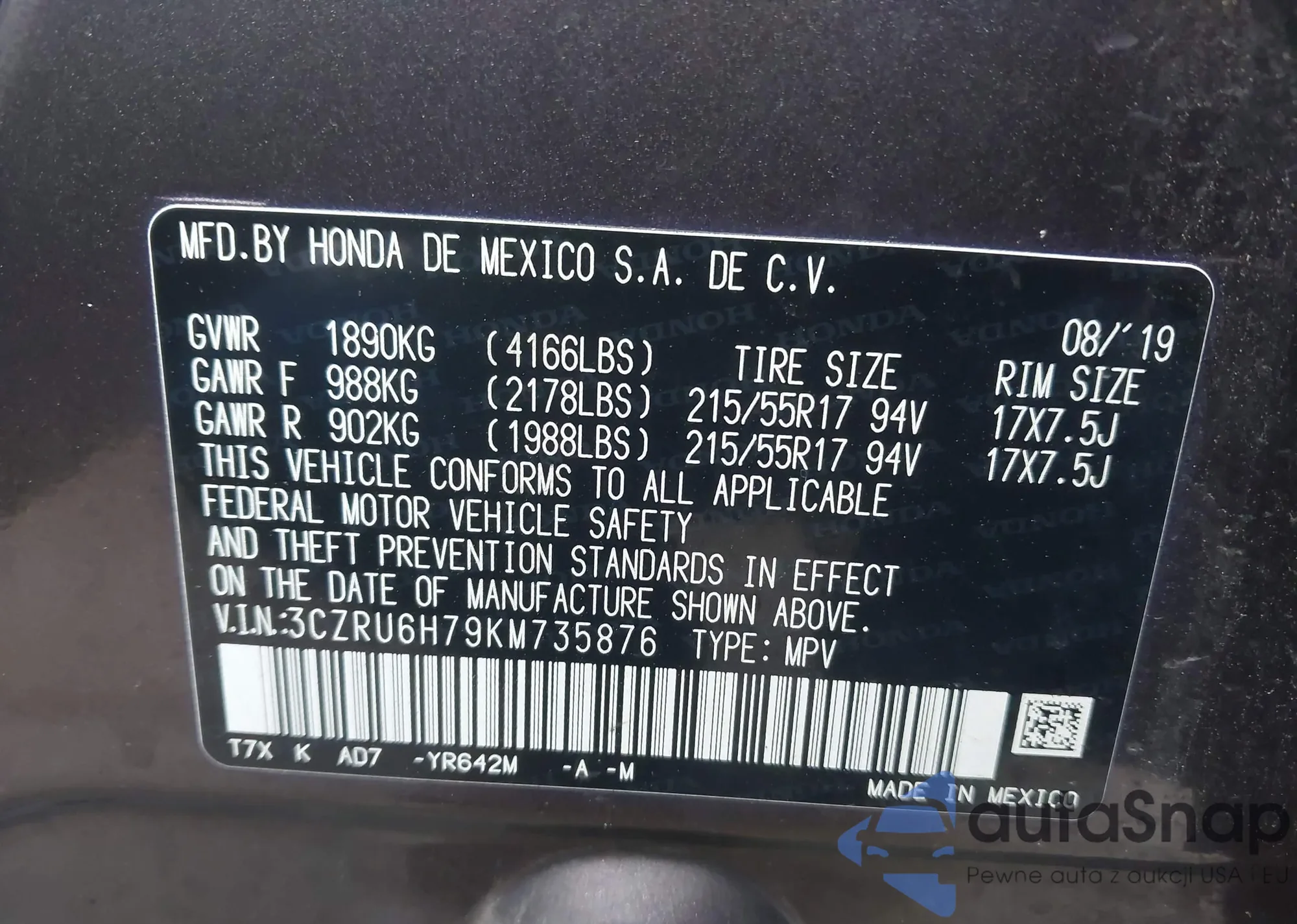 • VIN 3CZRU6H79KM735876