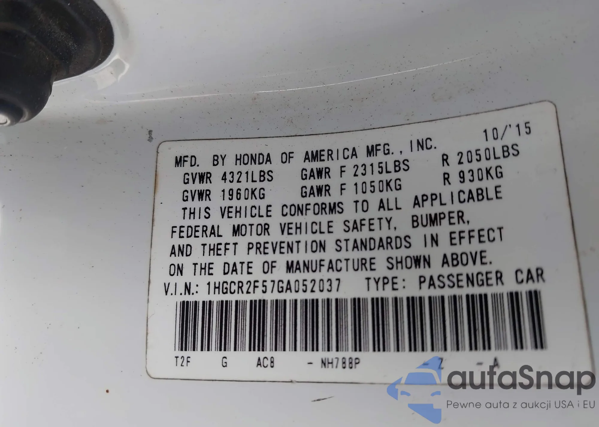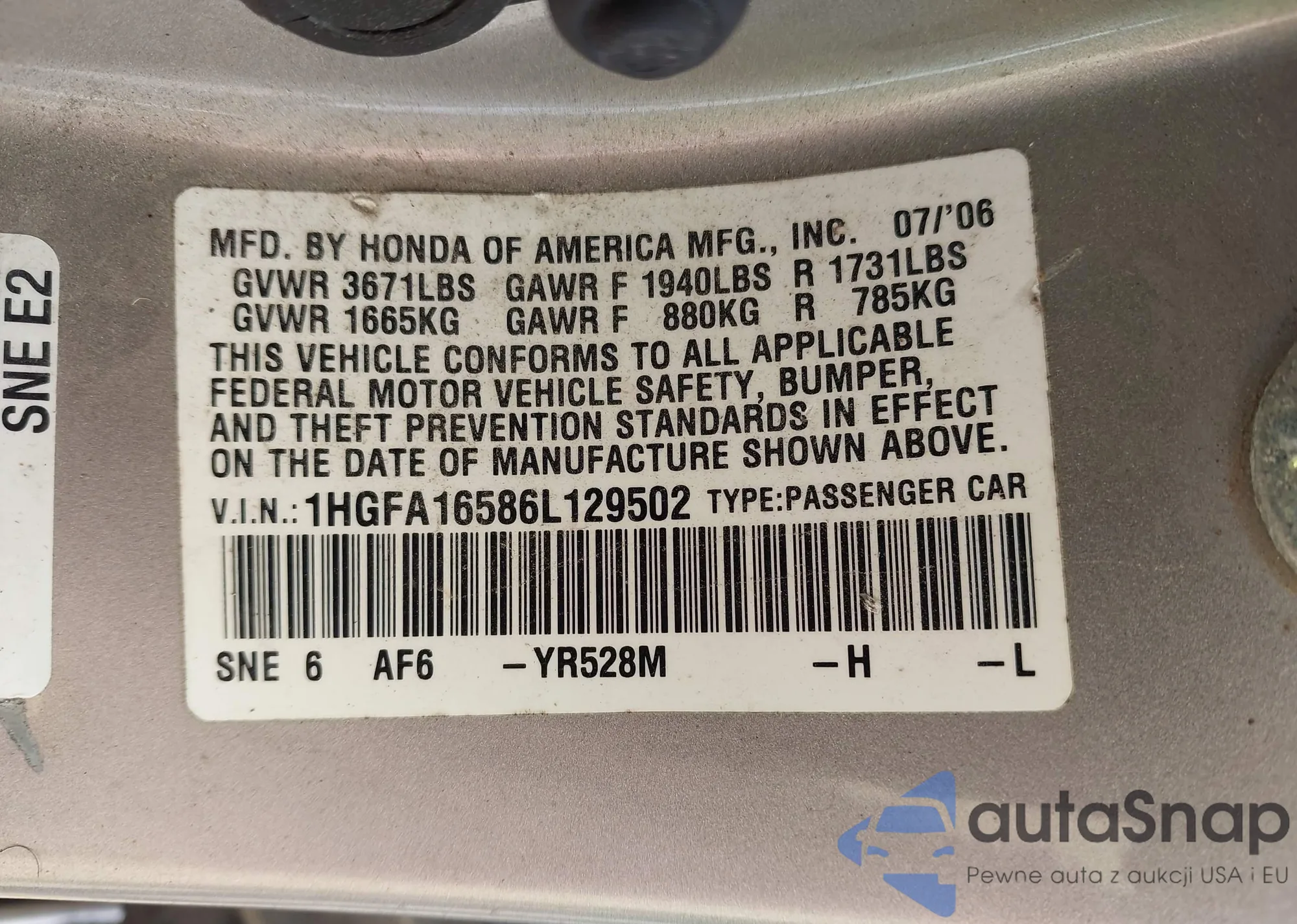 LOT: 43707869 VIN: 1HGFA16586L129502