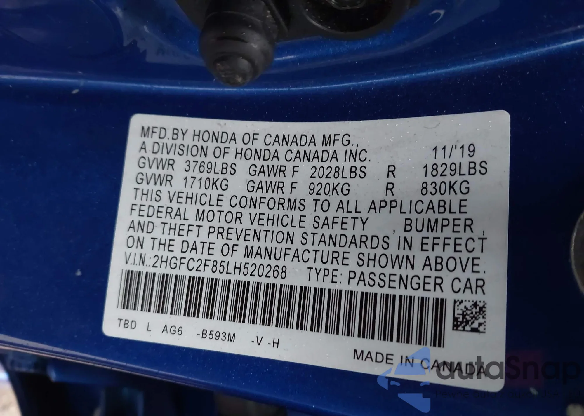 LOT: 44272573 VIN: 1HGCS1B81AA013790