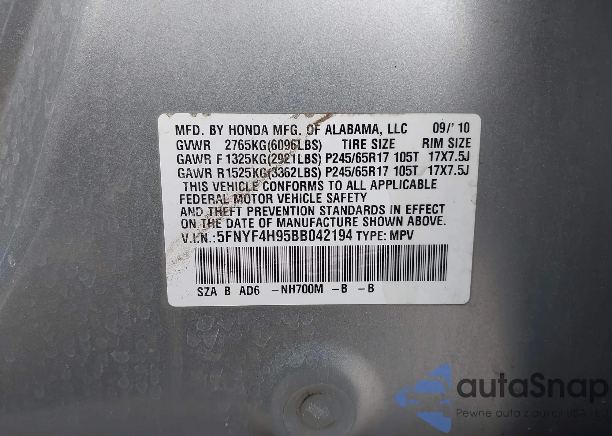 • VIN 5FNRL6H8XMB011011