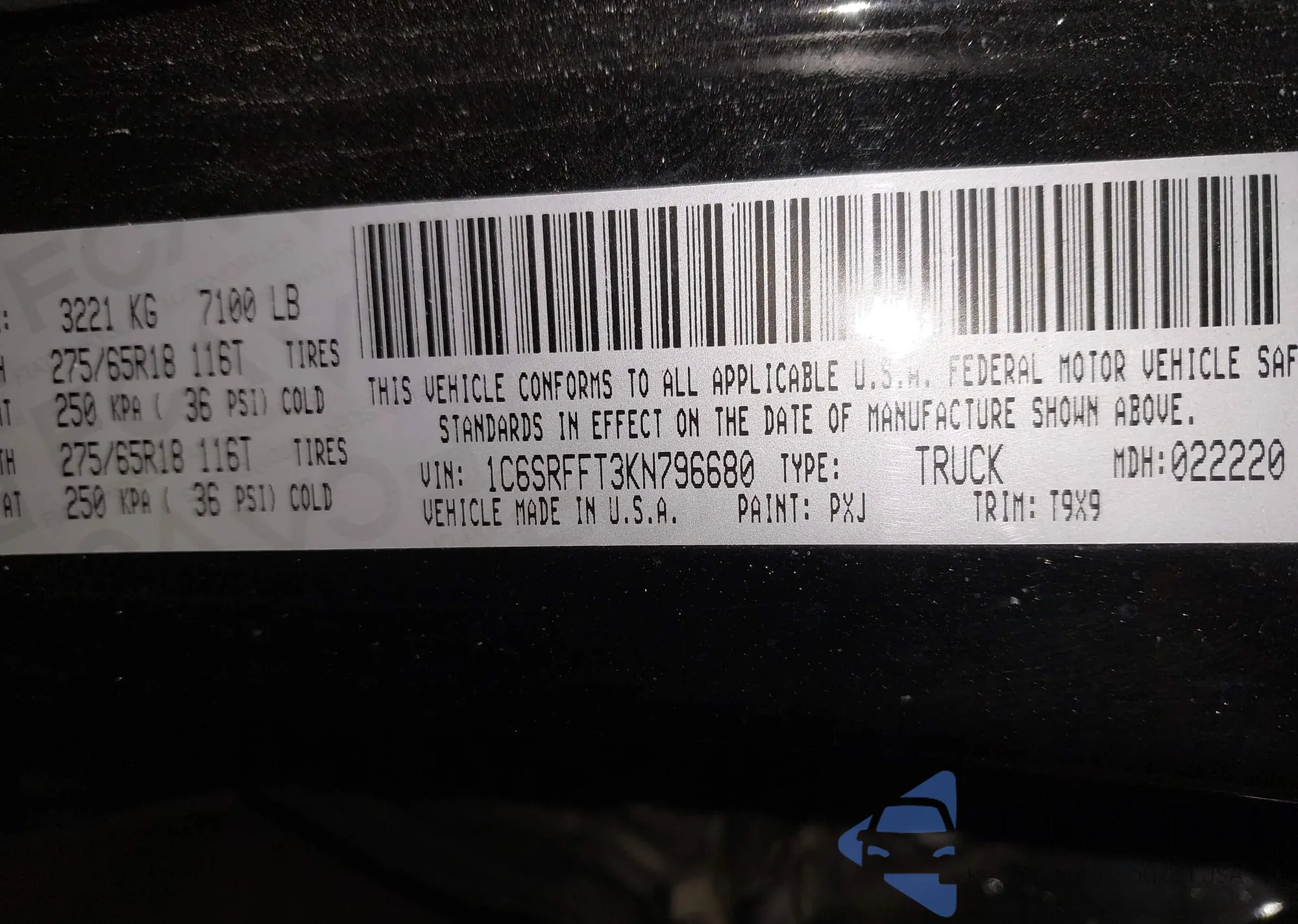 • VIN 1C6SRFFT3KN796680