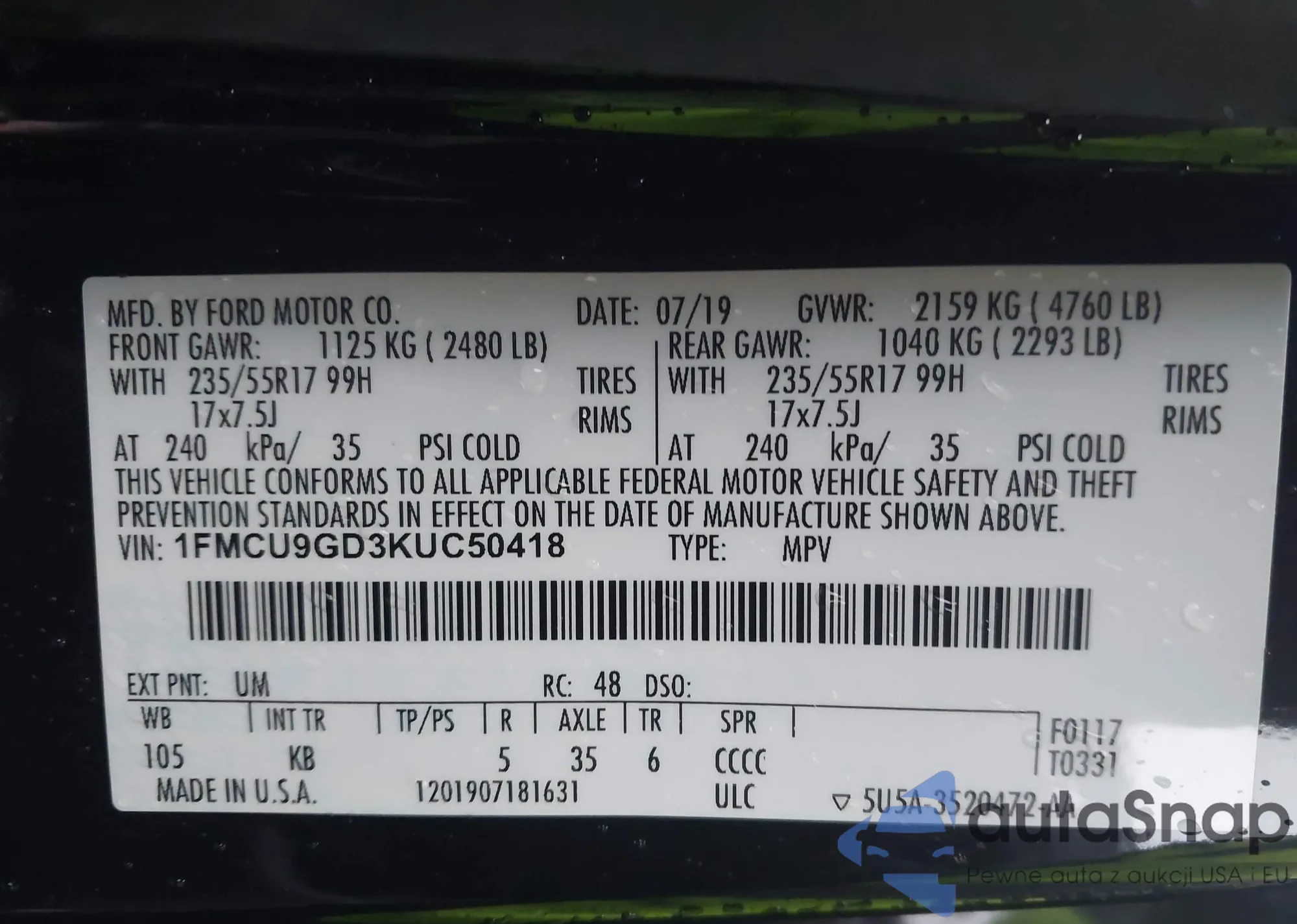 LOT: 44017175 VIN: 1FMCU9GD3KUC50418
