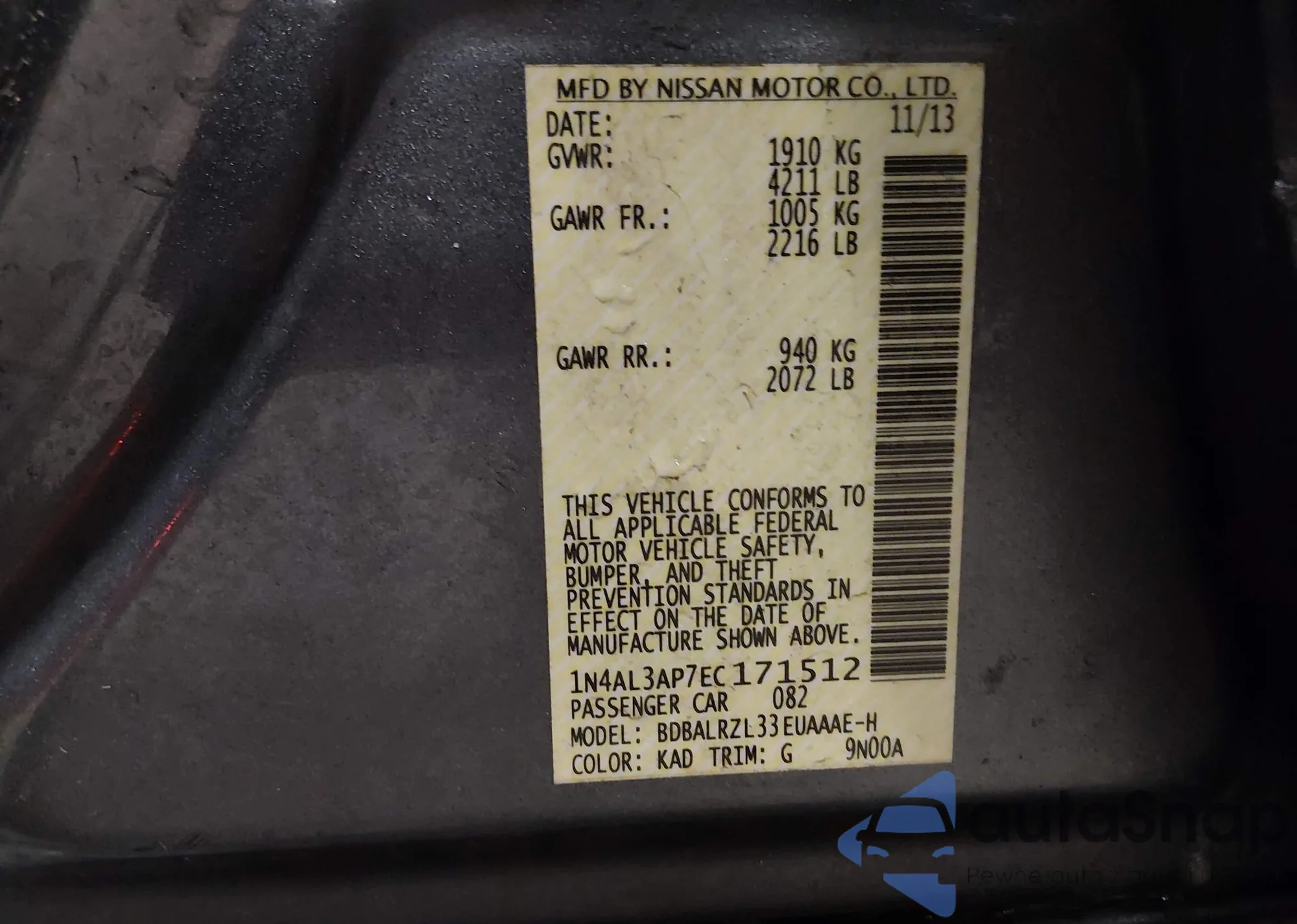 • VIN 1N4AL3AP7EC171512