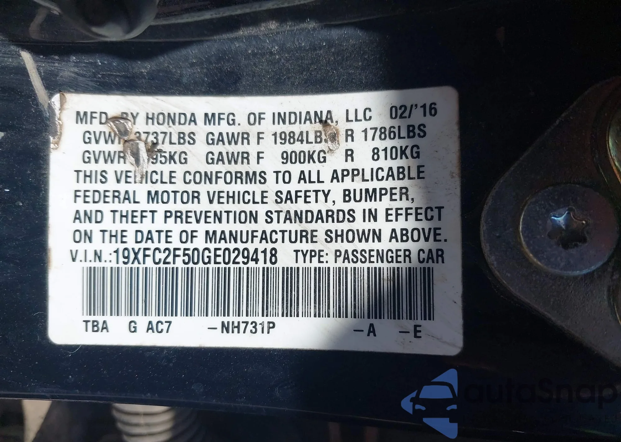• VIN 19XFC2F50GE029418