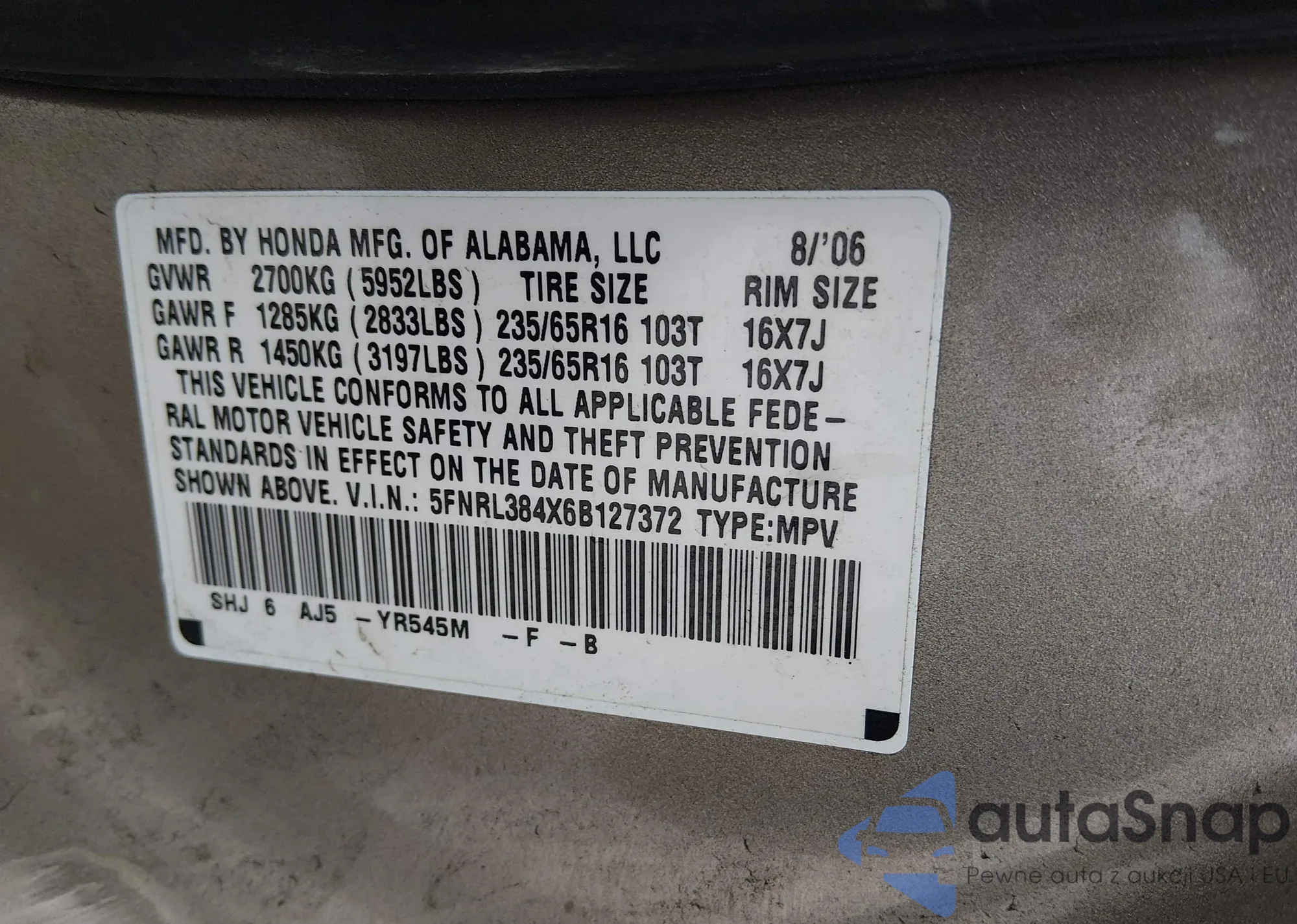 • VIN 5FNRL384X6B127372