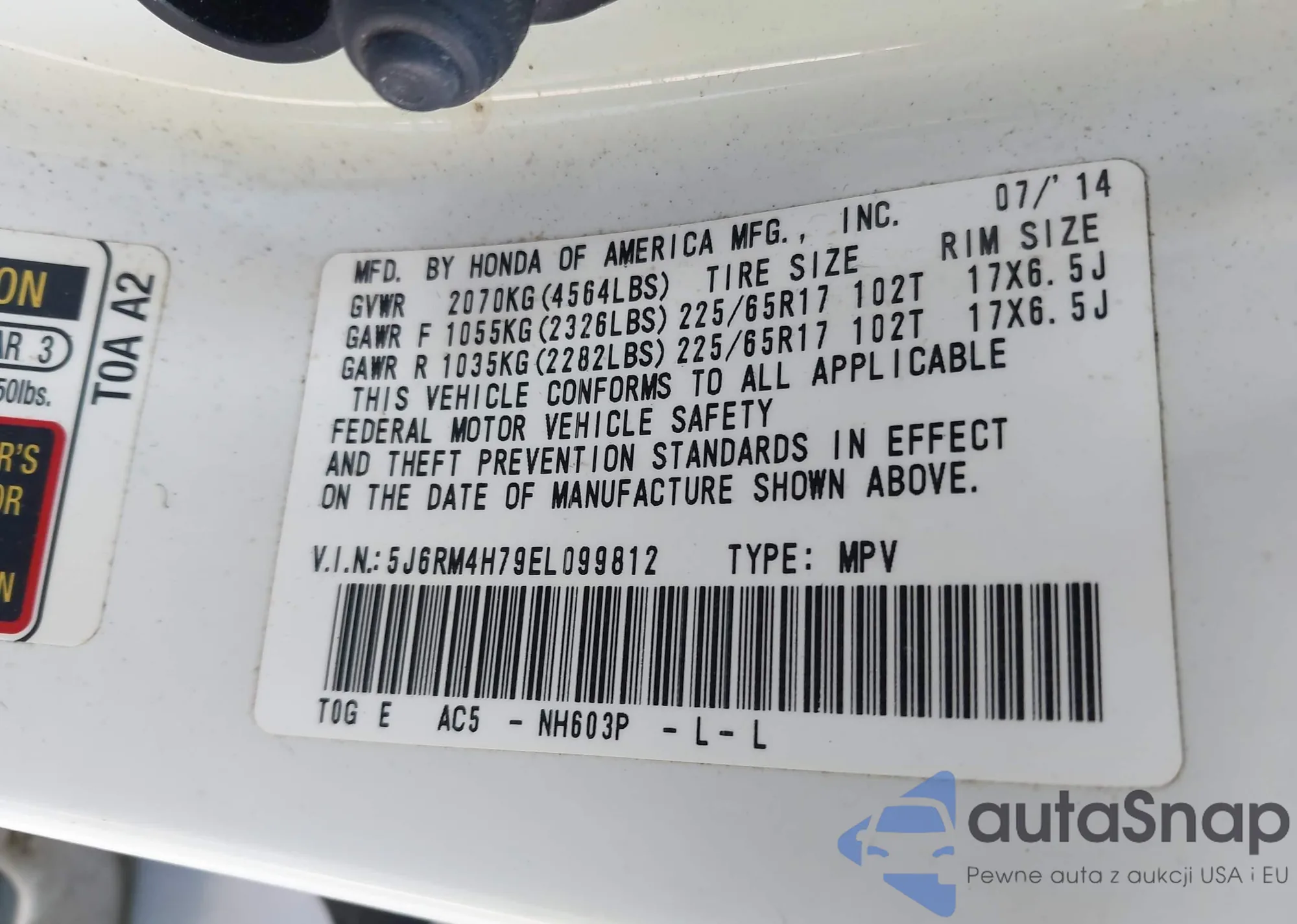• VIN 5J6RM4H79EL099812