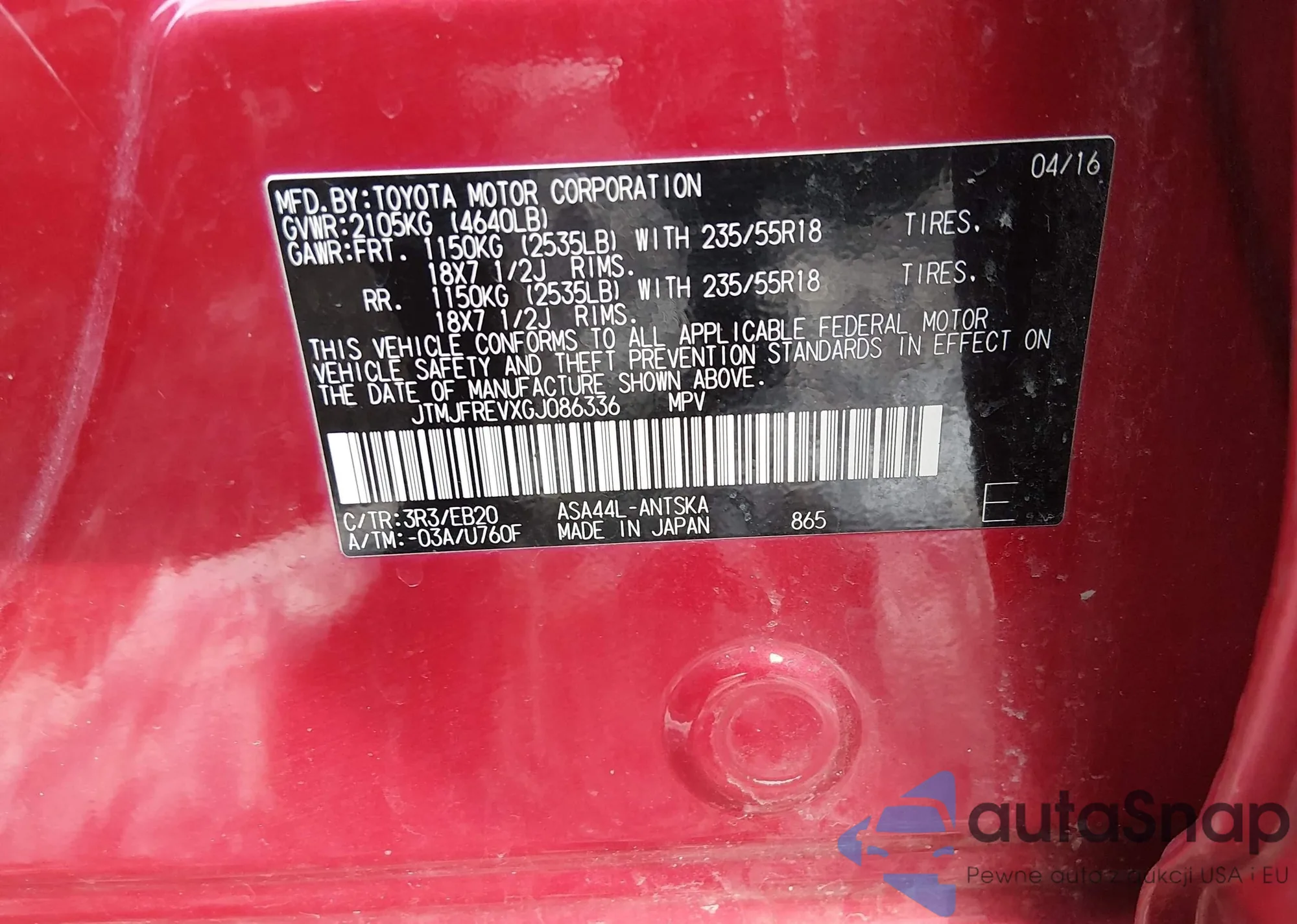 LOT: 44376100 VIN: JTMJFREVXGJ086336