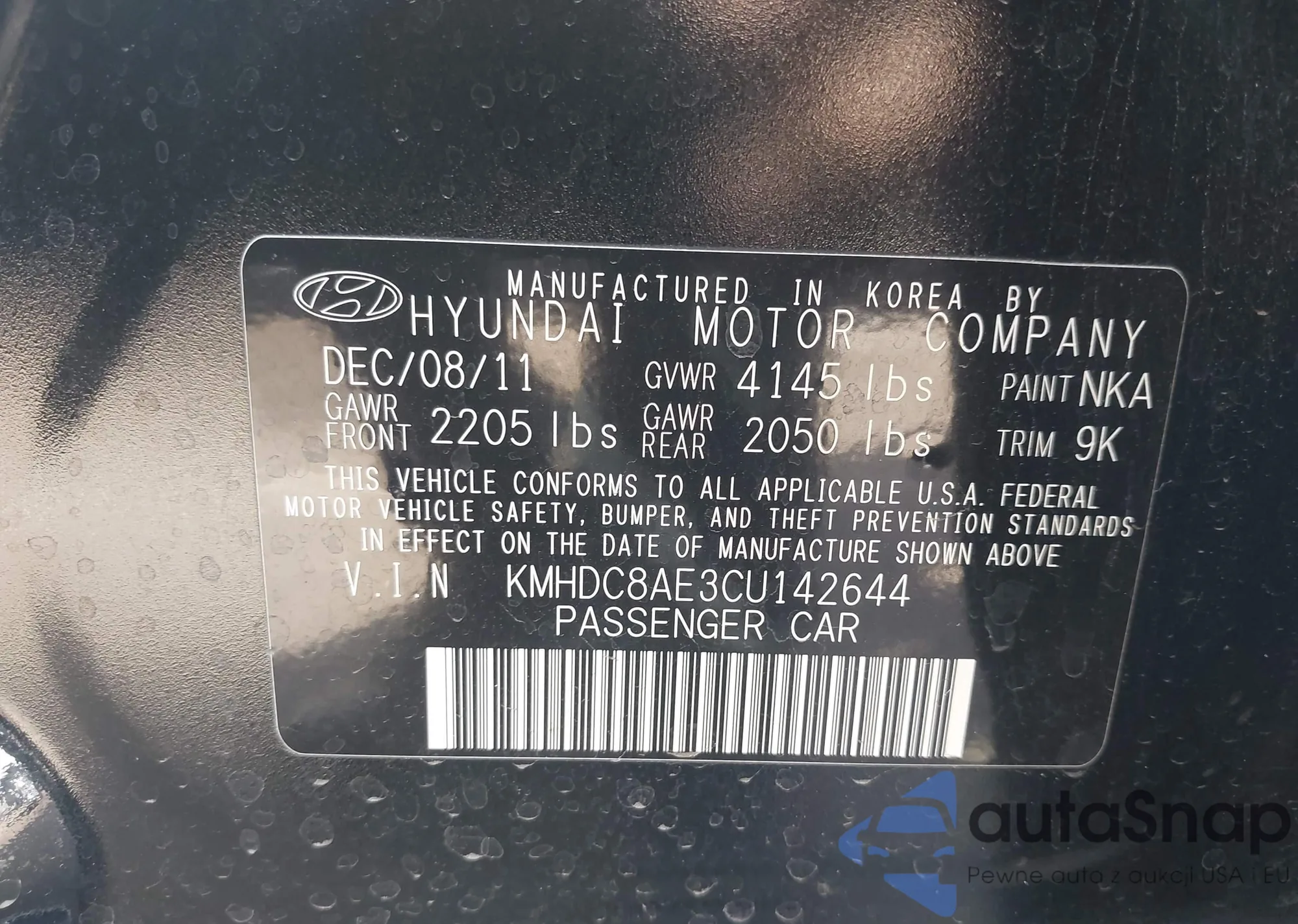 LOT: 44385389 VIN: KMHDC8AE3CU142644