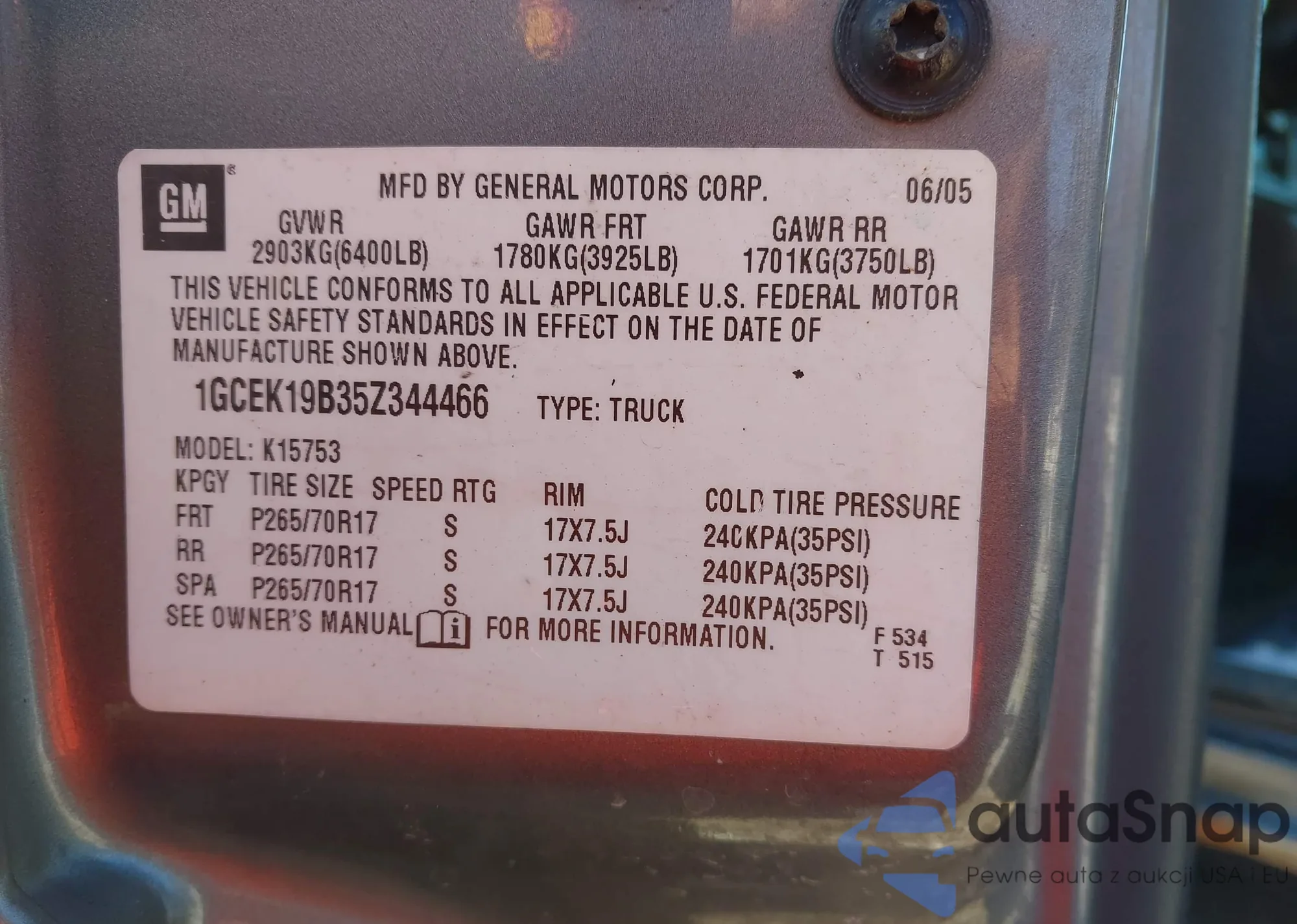 • VIN 1GCEK19B35Z344466