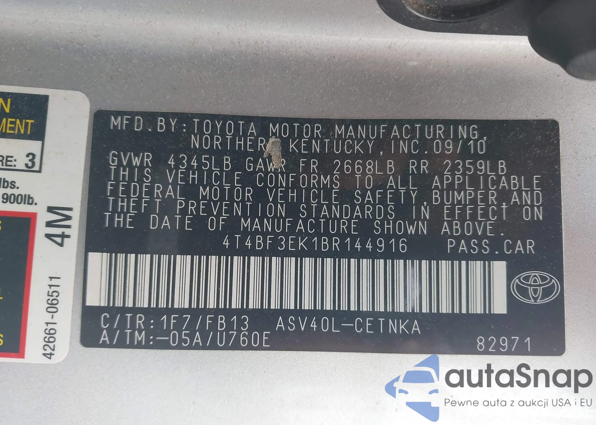 • VIN 4T4BF3EK1BR144916