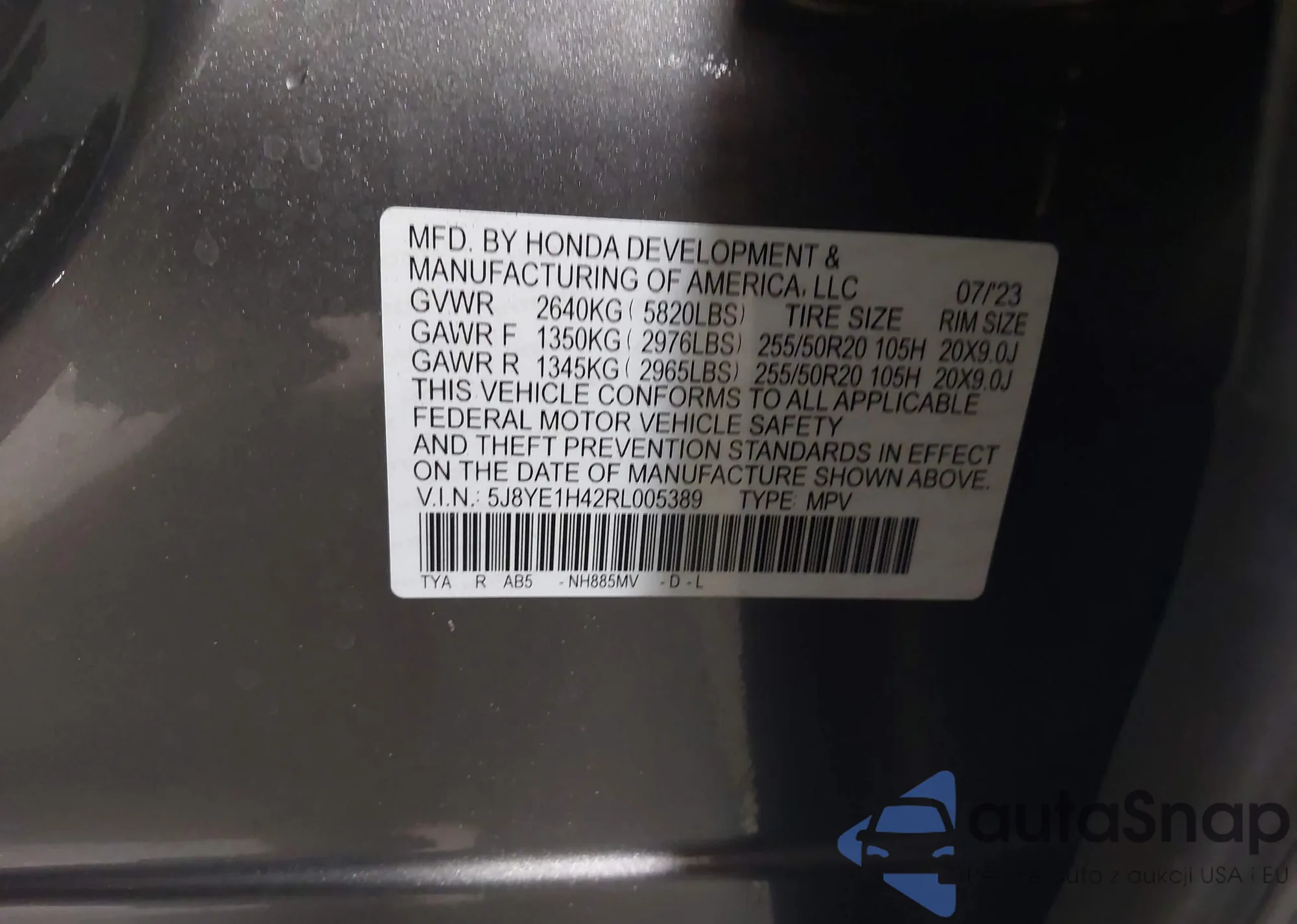 • VIN 5J8YE1H42RL005389