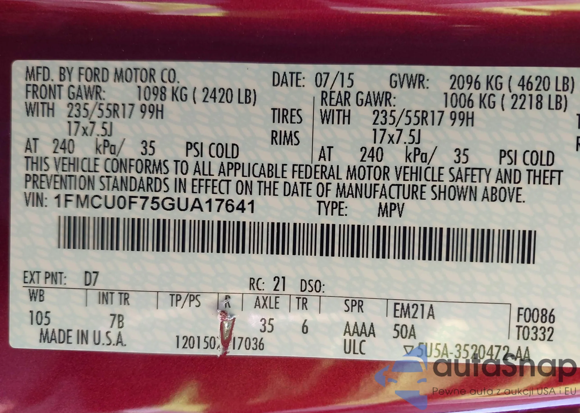 LOT: 44304018 VIN: 1FMCU0F75GUA17641