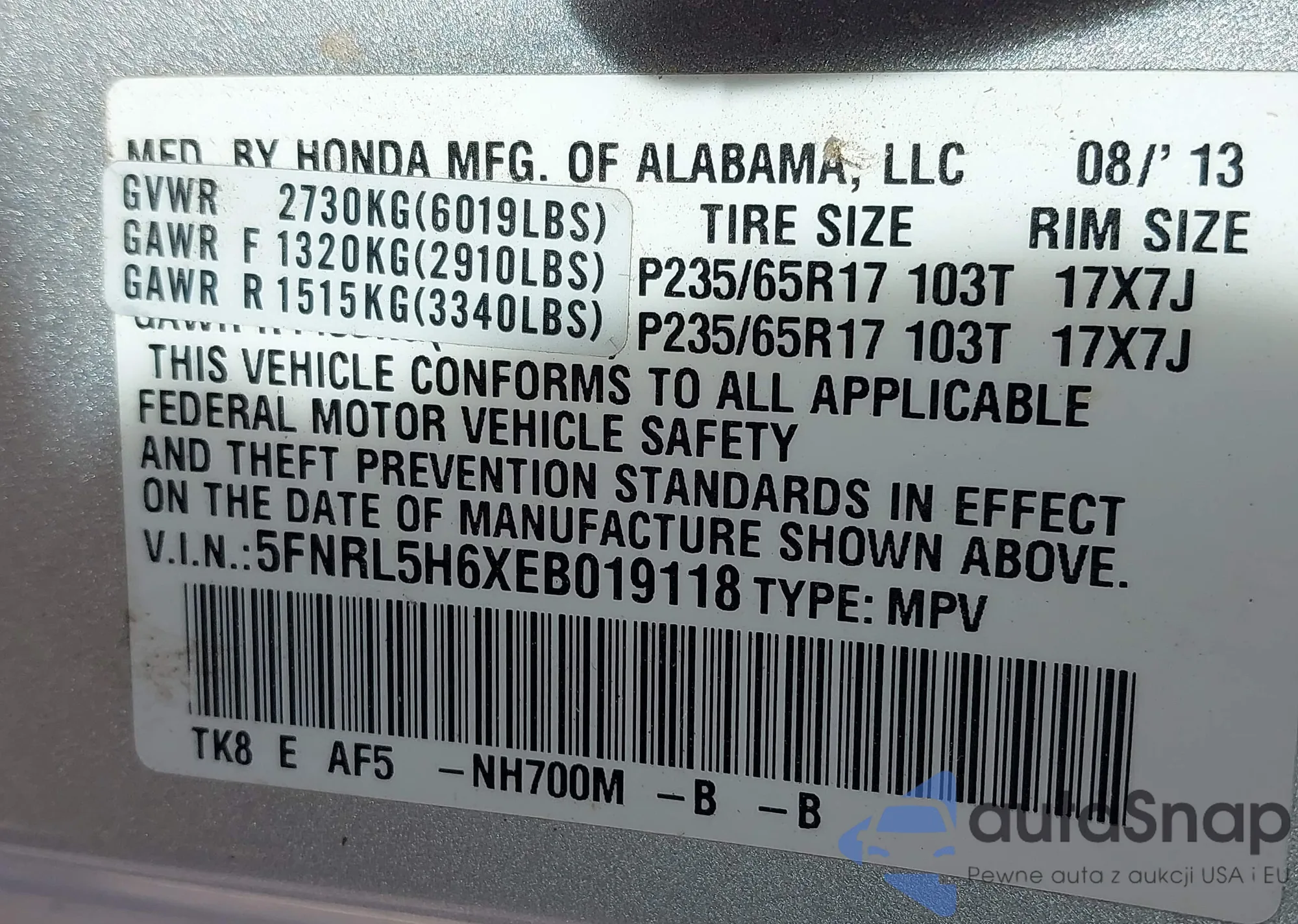 • VIN 5FNRL5H6XEB019118