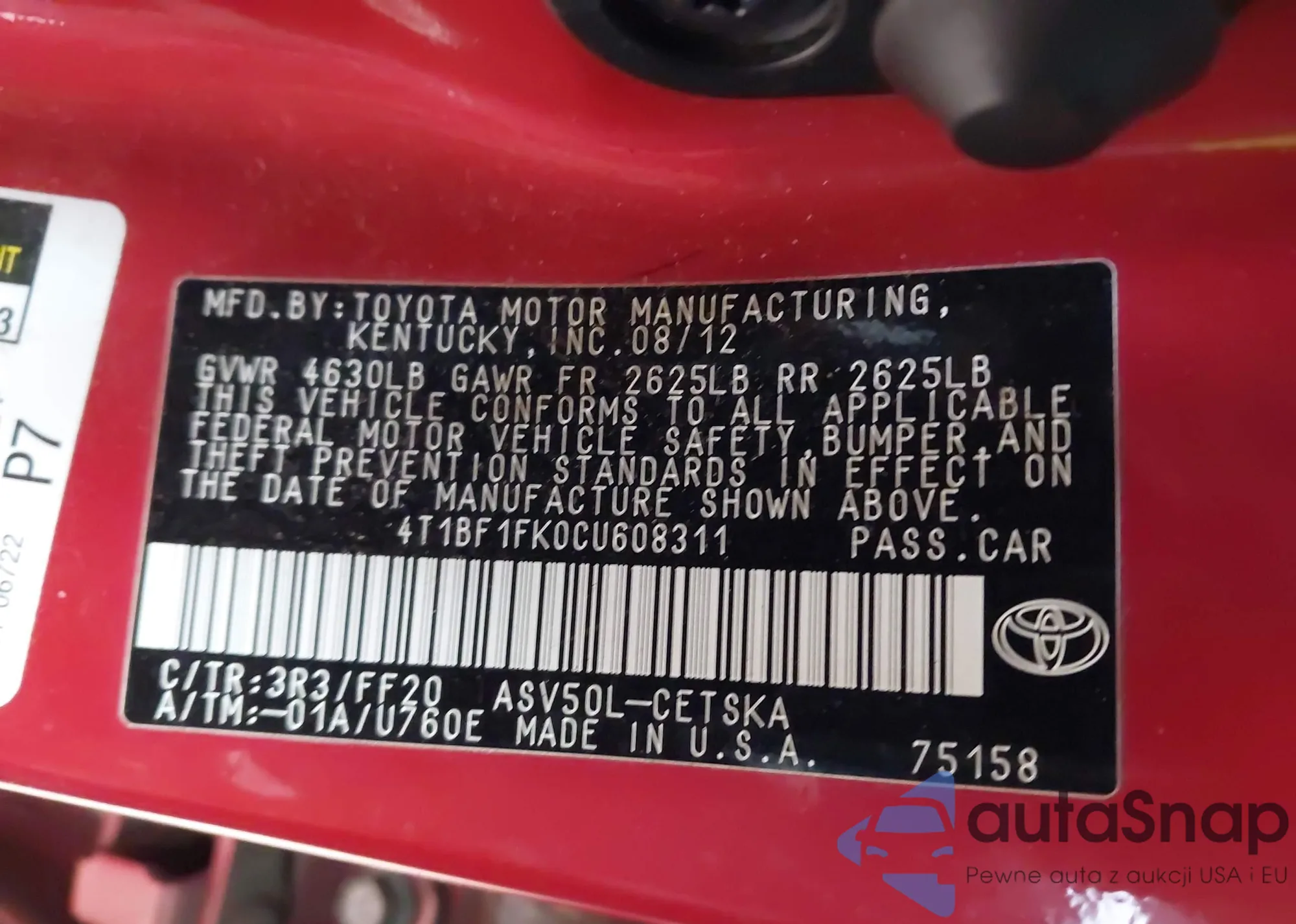 • VIN 4T1BF1FK0CU608311