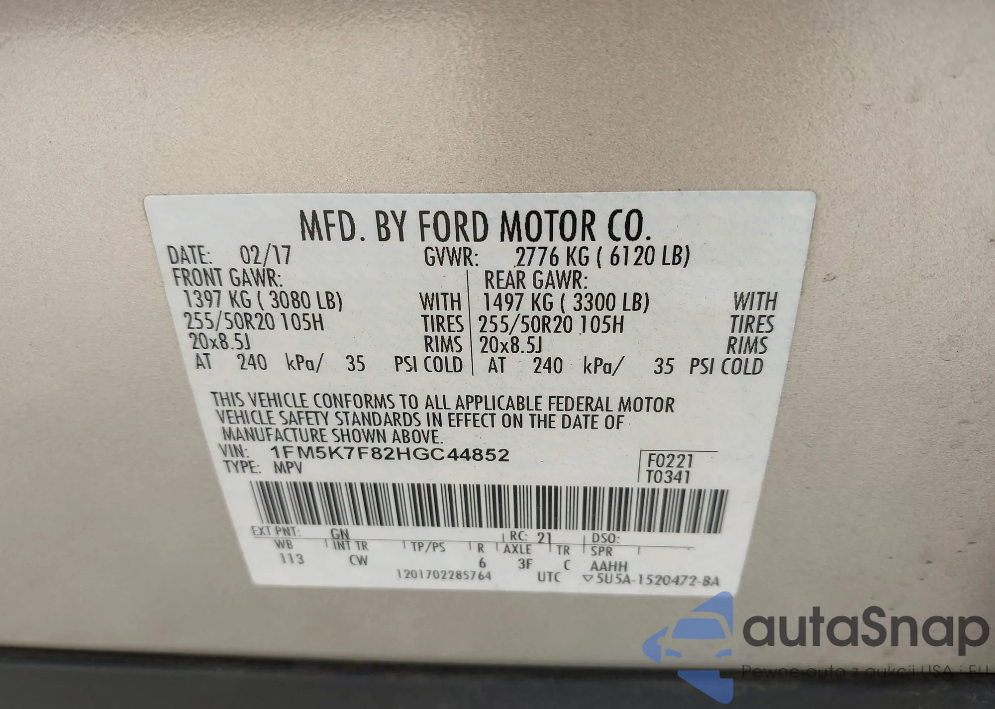 LOT: 44343103 VIN: 1FM5K7F82HGC44852